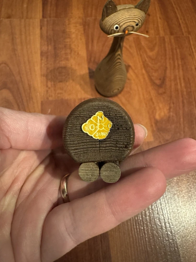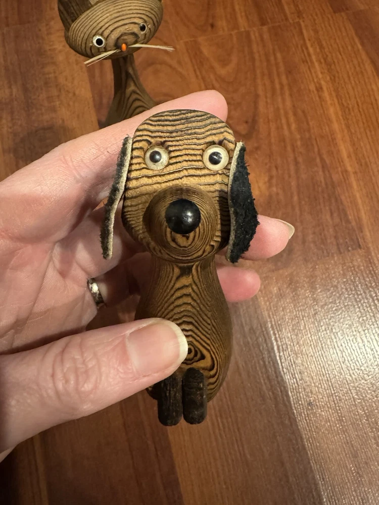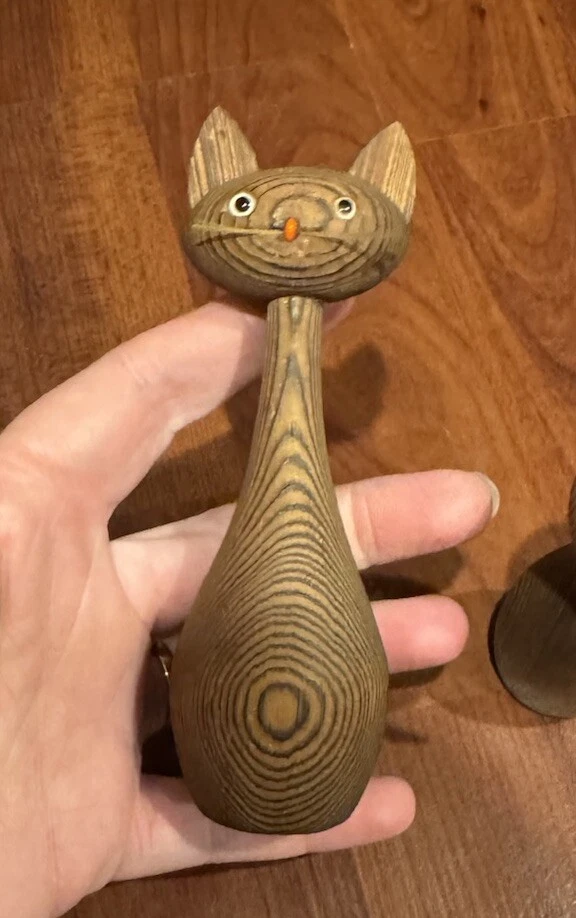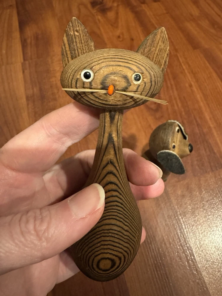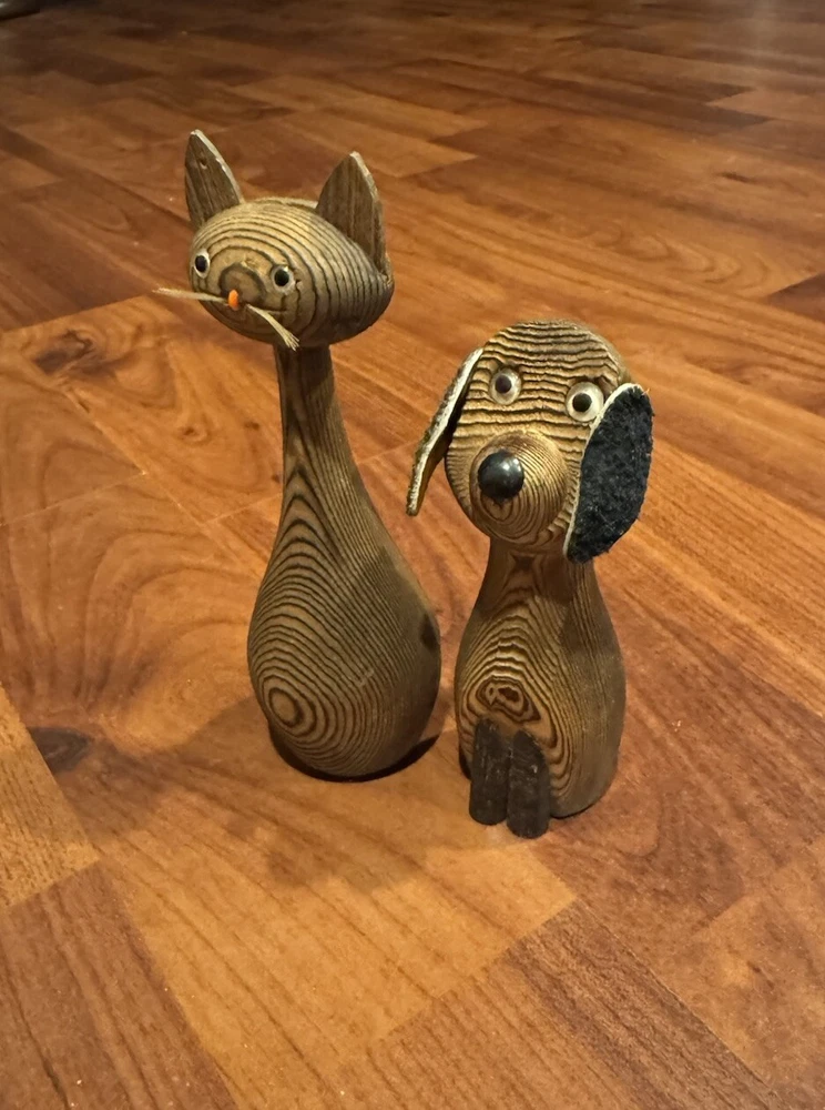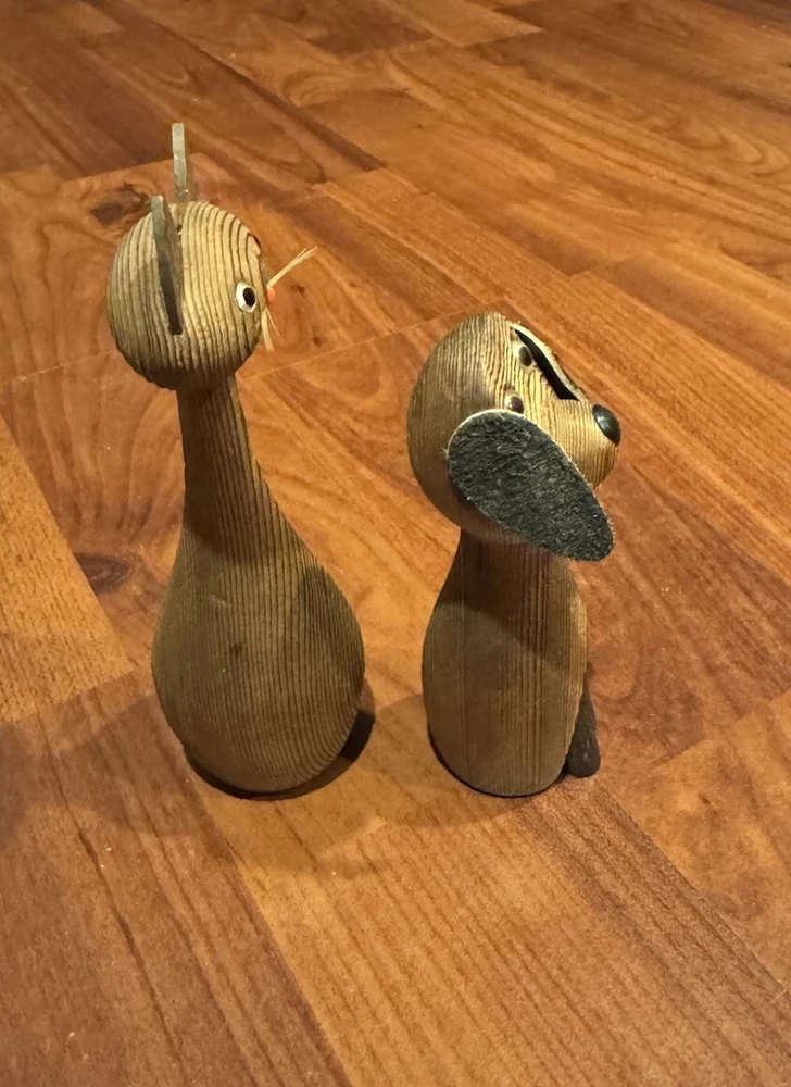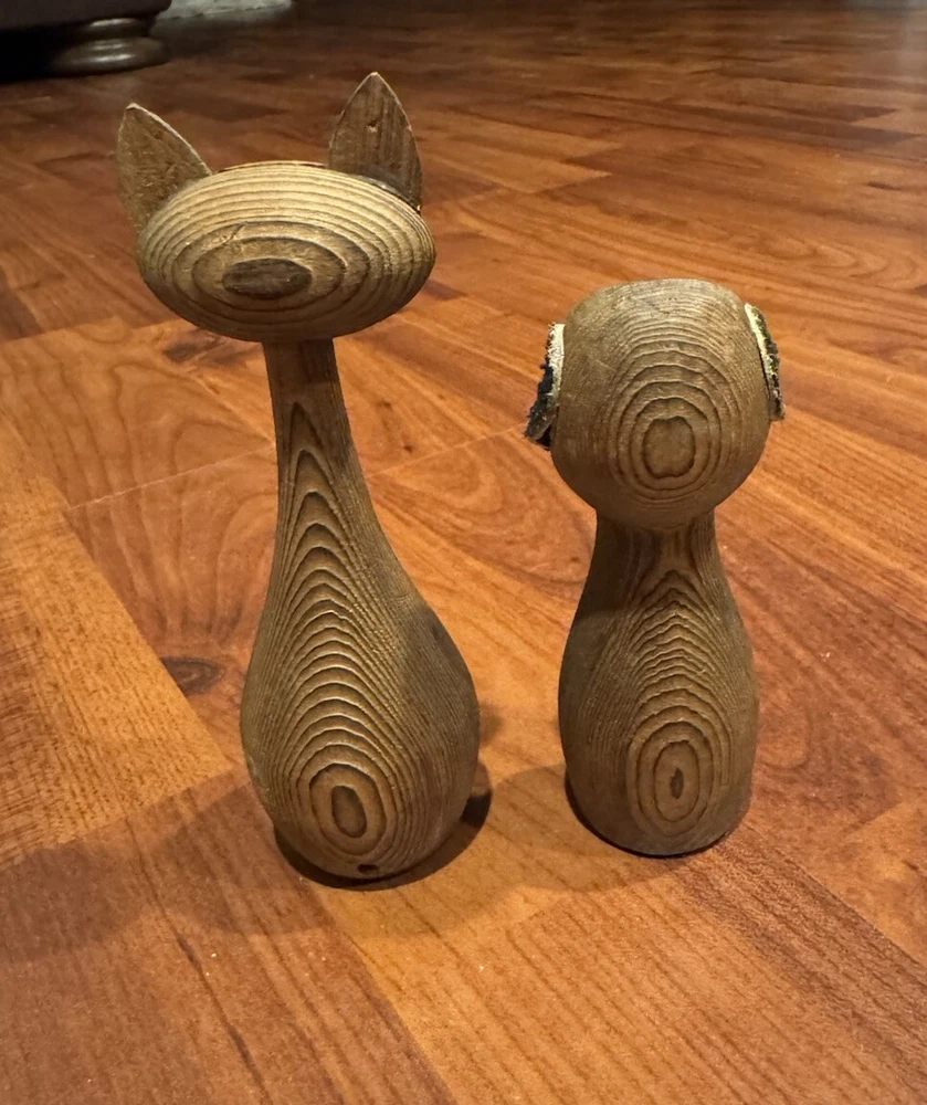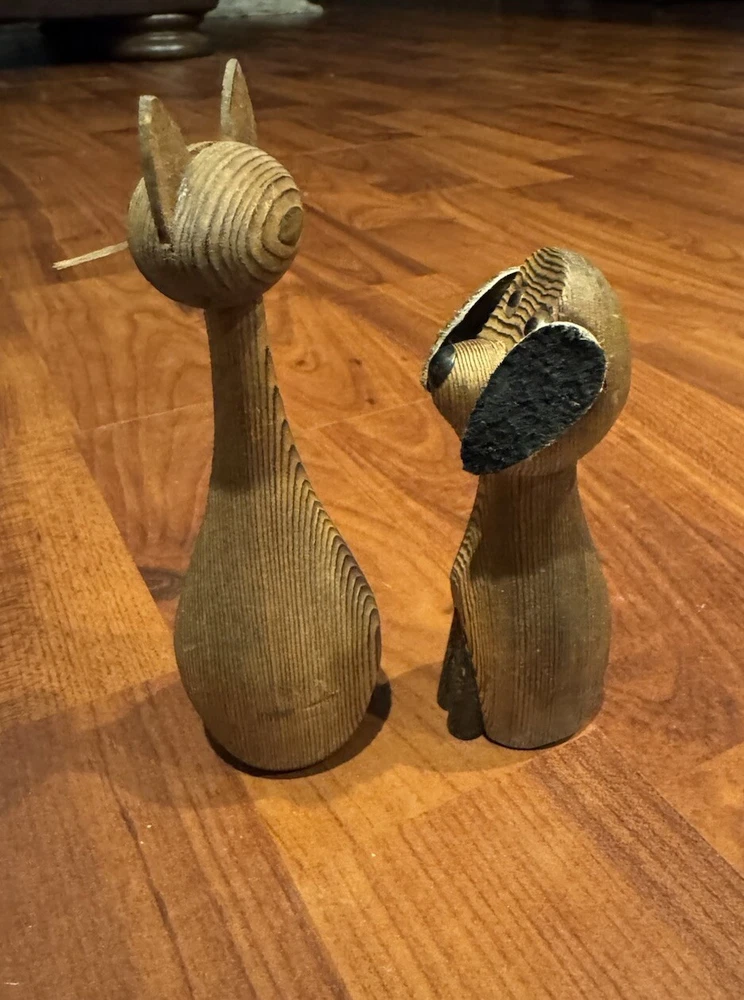 This vintage Otagiri figurine set from Japan features a charming cat and dog design, perfect for adding a touch of mid-century modernism to your decor. The beautiful cryptomeria wood carving and natural finish make this set a unique addition to any collection. The set includes two figurines, one measuring 5 inches and the other measuring 4 inches in height. The glass eyes add a realistic touch to the design, making it a great choice for cat and dog lovers alike. Made in Japan, this set is sure to impress any collector. ** Cat is missing original tail.