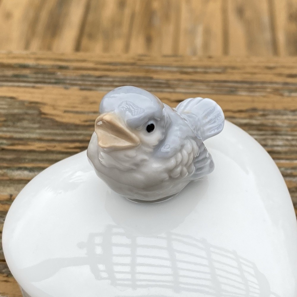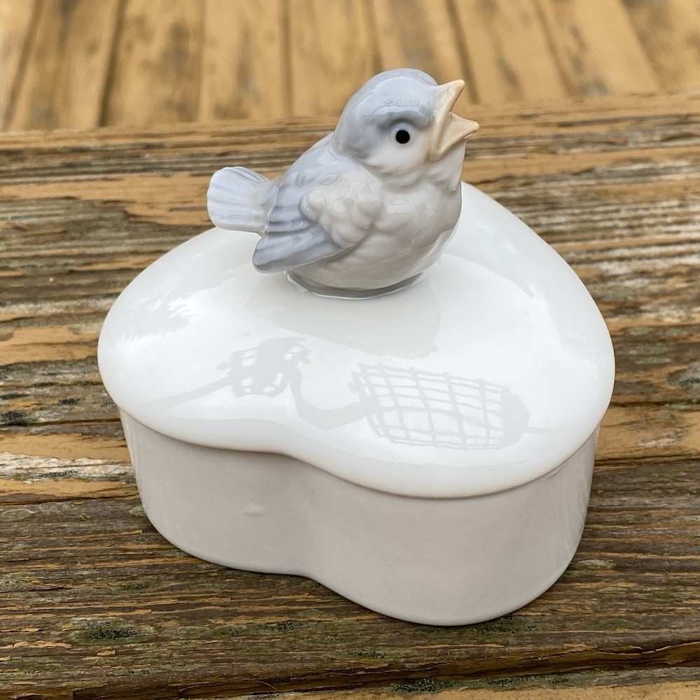 Vintage Otagiri Porcelain Heart Trinket Box Gray Figural Bird on Lid Japan. 3” wide. 3.5” tall No chips, cracks or crazing Sweet Trinket Box Cute! Great addition to a gift basket.