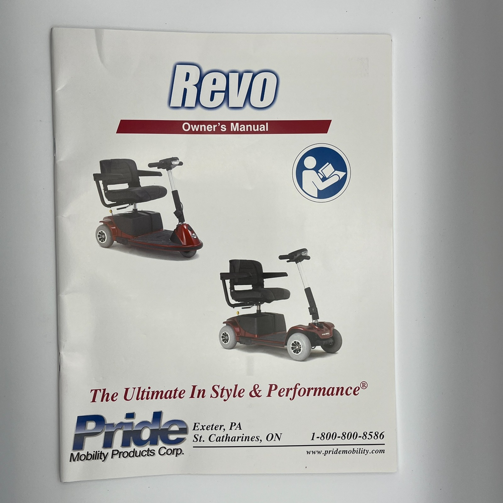 Vintage Owner's Manual REVO Pride 3-wheel Mobility Scooter w/ 3 Cotterless pins c2005 This is an original (not photocopied) owner's manual for Pride Mobility Revo 3-wheeled scooter PM2A3-S11G with 3 cotterless pins and allen wrench. Size: approximately 11 x 8-1/2 inches 39 pages. Includes 3 cotterless pins and an allen wrench This item has very minimal expected signs of aging like yellowing, stains, creases, and tears. Zoom in on the photos for details and to assess condition. Items will ship in a semi-rigid envelope. I hope this is something you've been looking for. Inventory Note: OM1-N