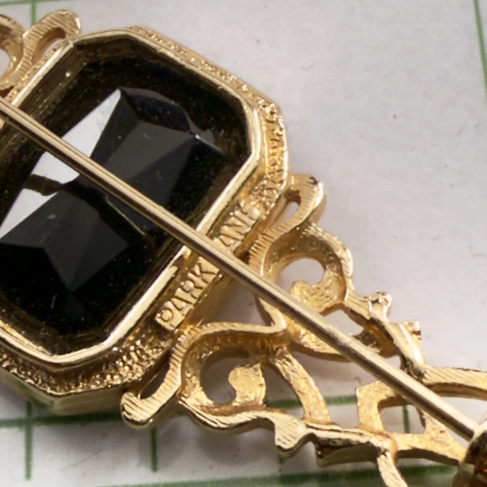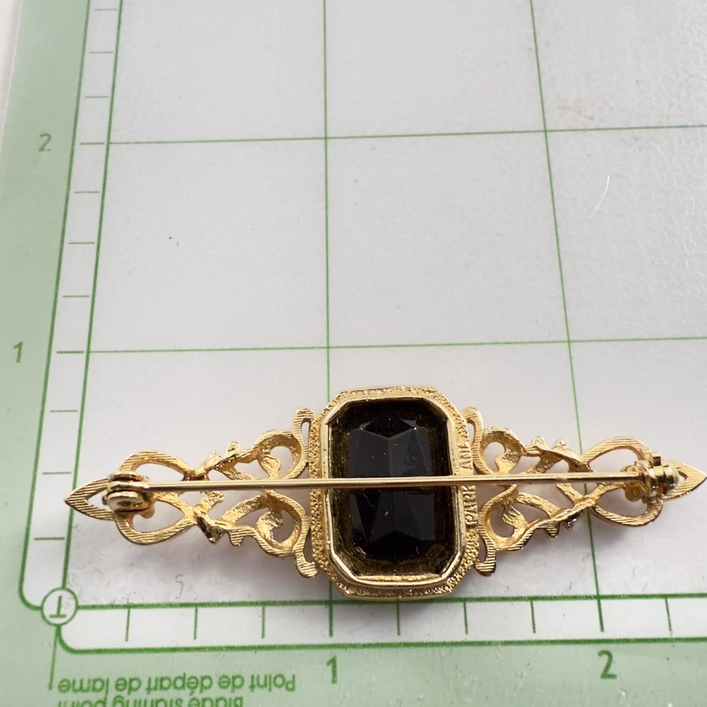 Vintage PARK LANE Black Faux Onyx Gold Tone Brooch Estate Pin. Pre-Owned Estate Jewelry in Very Good Condition. Ready to wear, give as gift or add to a collection. Our Vintage items are mostly from estate sales and vary in age from 100+ years old to more modern pieces. Please use your judgement. Items are photographed on a measuring matte with one-inch squares to give you an idea of size. Any photography props / holders you see are not included.