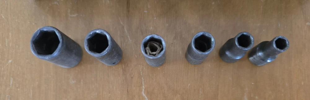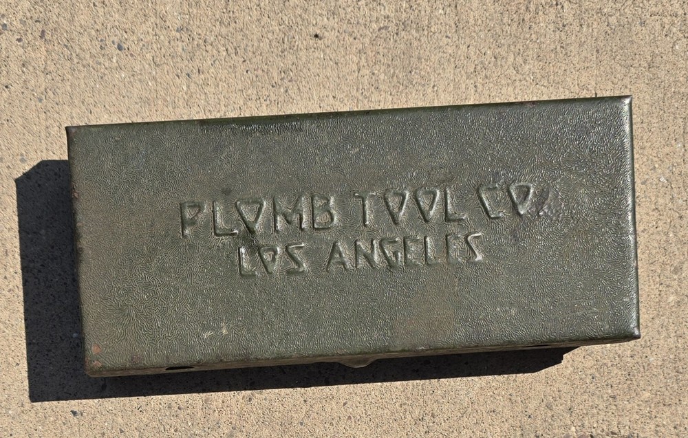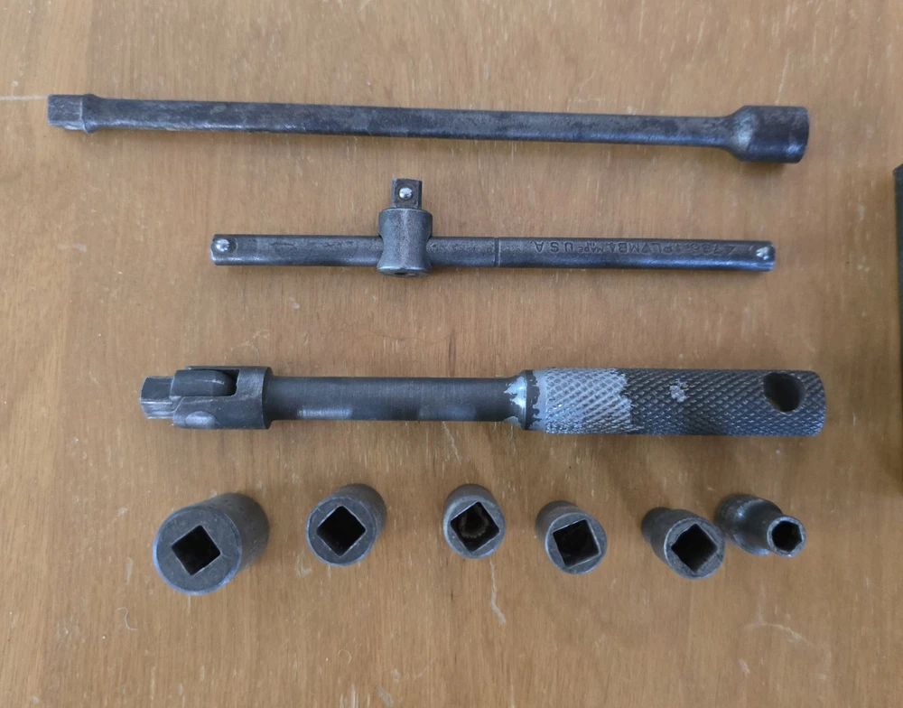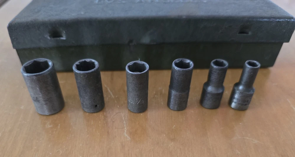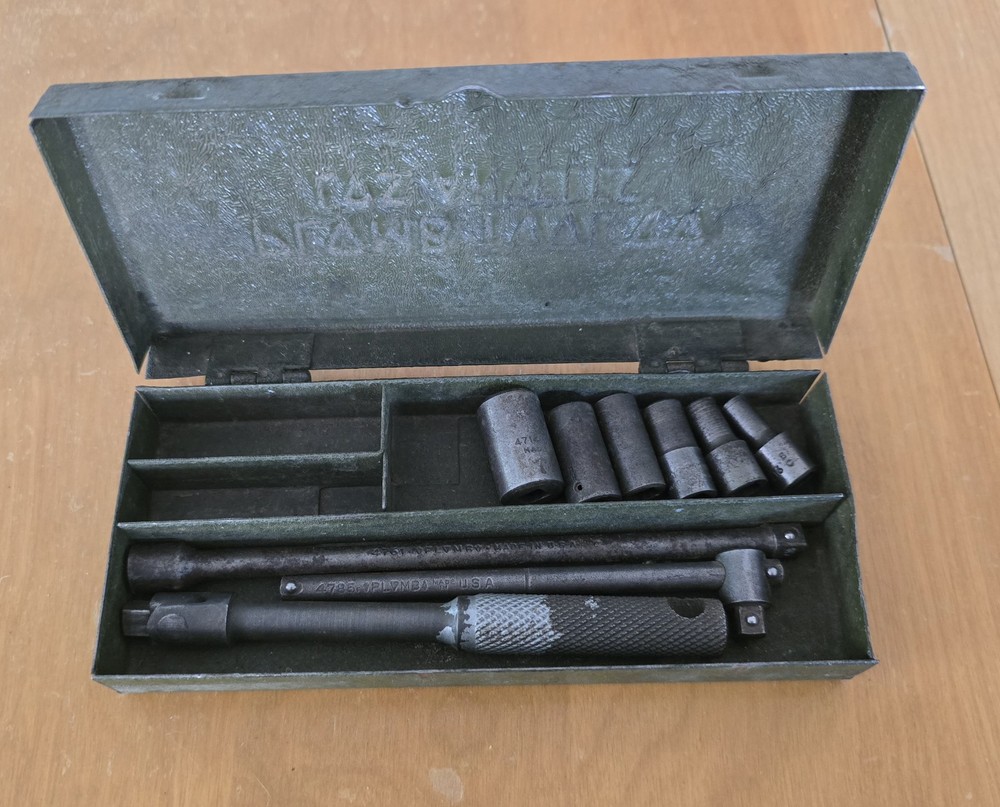 The box is 6.5in long and 3 inches wide and in great condition for its age. It closes tight and I don't see any rust. Six Sockets, 6 inch extension, t- bar, and breaker bar.