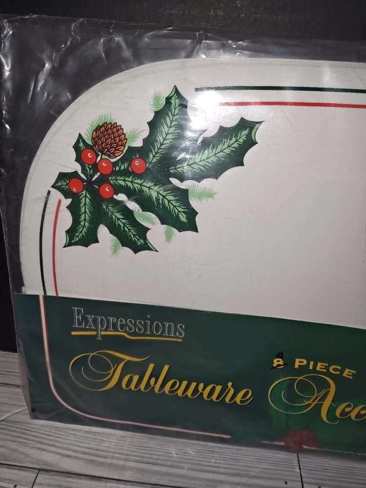 Features: Smooth Type: Placemat Material: PVC Vinyl Theme: Christmas, Holiday Country/Region of Manufacture: China Pattern: Floral Color: Multicolor Brand: Expressions Occasion: Christmas Shape: Oval Number of Items in Set: 8