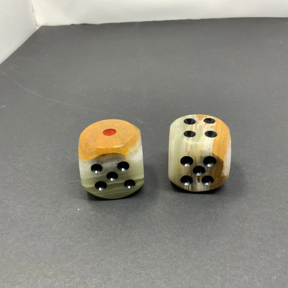 This is a vintage pair of hand-made onyx/marble dice measuring 1.57 inches . They can be used as office décor or paperweights. The dice are made of marble and were likely crafted by an unknown artisan. They are a unique and decorative addition to any collection. Located in mini cabinet