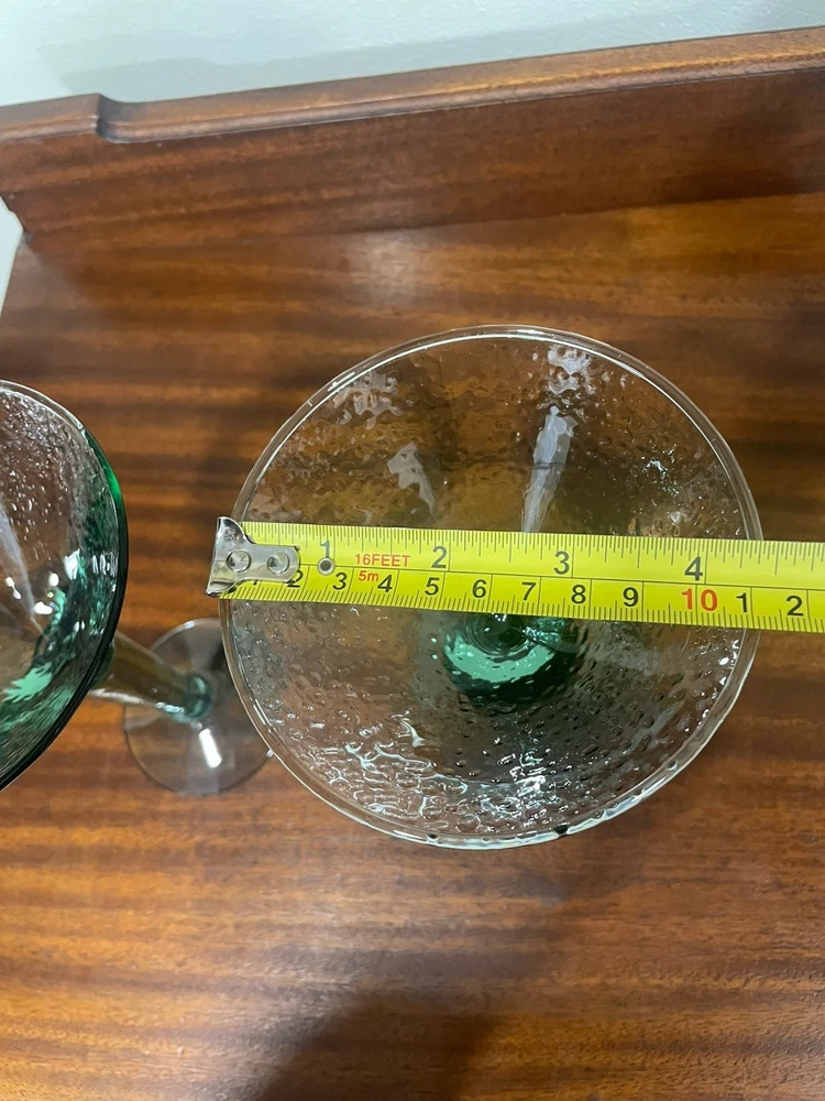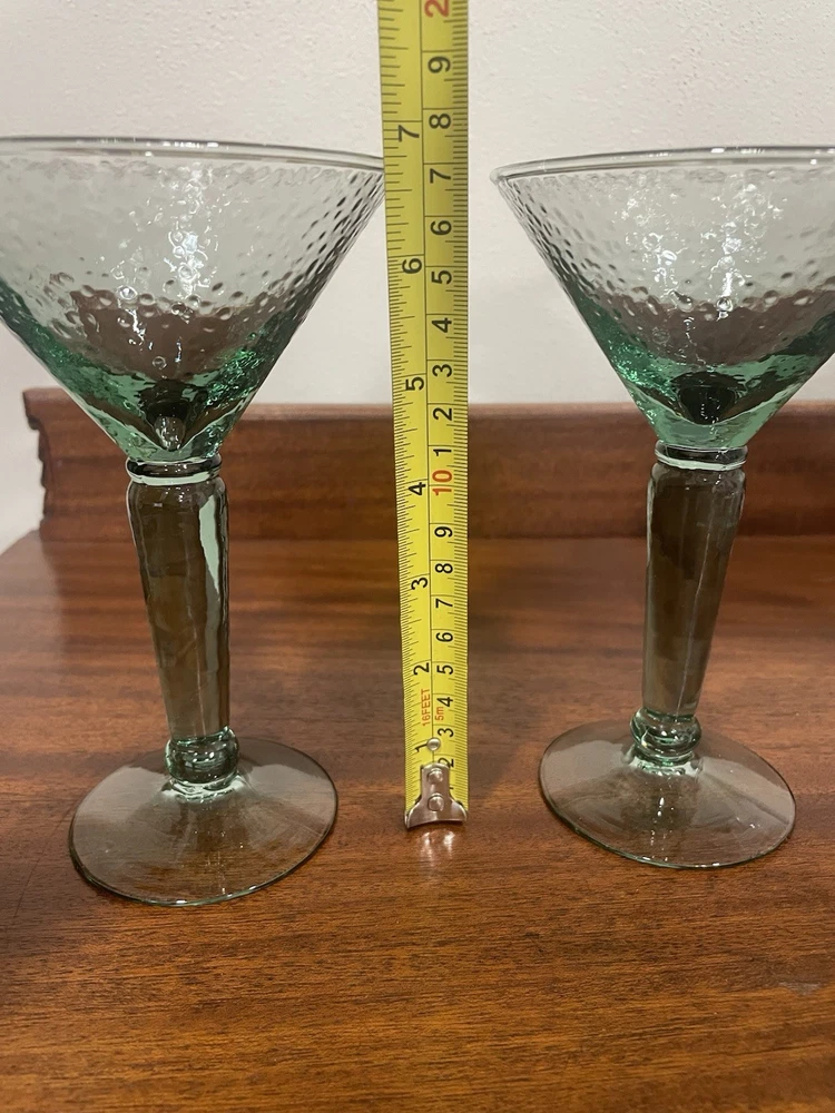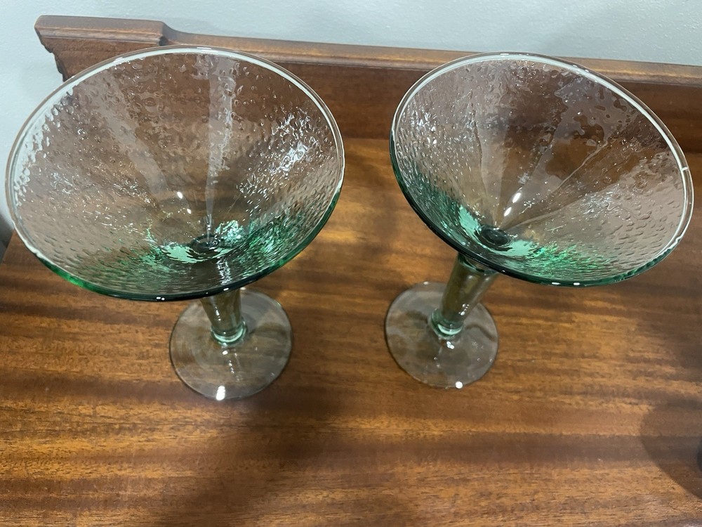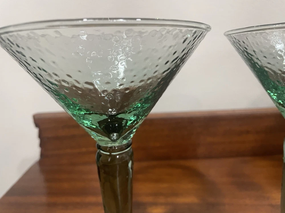 Elevate your home bar collection with this vintage lot of two light green pebbled martini glasses. The glasses stand at an impressive 7 inches tall and showcase a glossy finish that catches the eye. The unmarked glasses are made of pressed glass and have a production style of art glass, making them a unique addition to your drinkware. Each glass is handmade, adding a touch of craftsmanship to your collection. The glasses are perfect for serving margaritas or any other cocktail that you enjoy. Add a touch of elegance to your parties with these beautiful glasses.