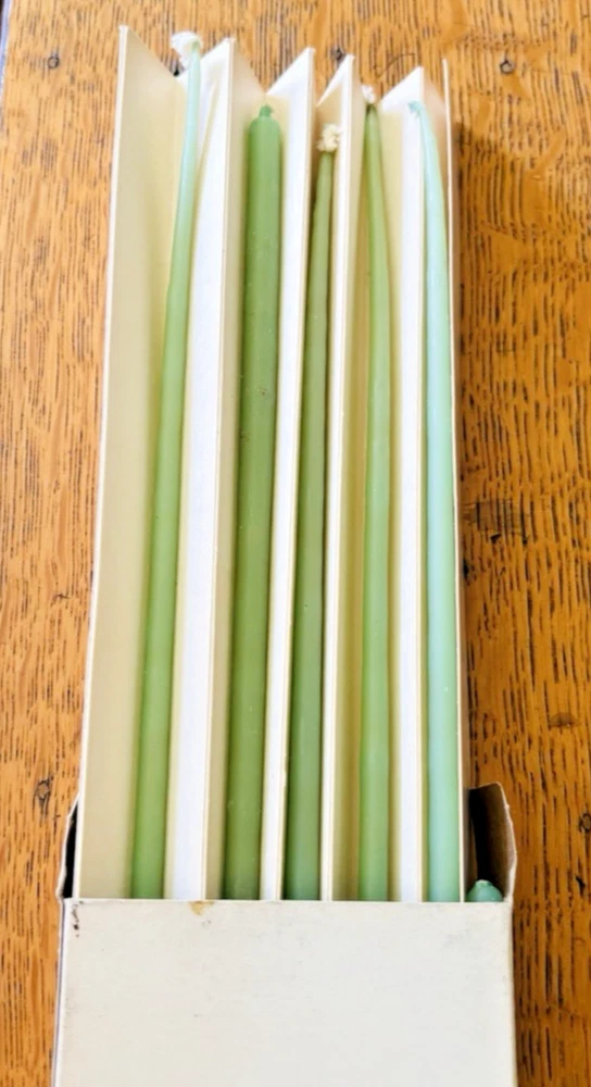 Type: Taper Candle Features: Decorative, Hand-Dipped, Non-Drip, Single Wick Number in Pack: 11 Shape: Taper Style: Vintage Theme: All Occasion Item Height: 15 in Color: Green Size: 15" Scent: Unscented Brand: Chateau Material: Wax Handmade: Yes Country/Region of Manufacture: United States