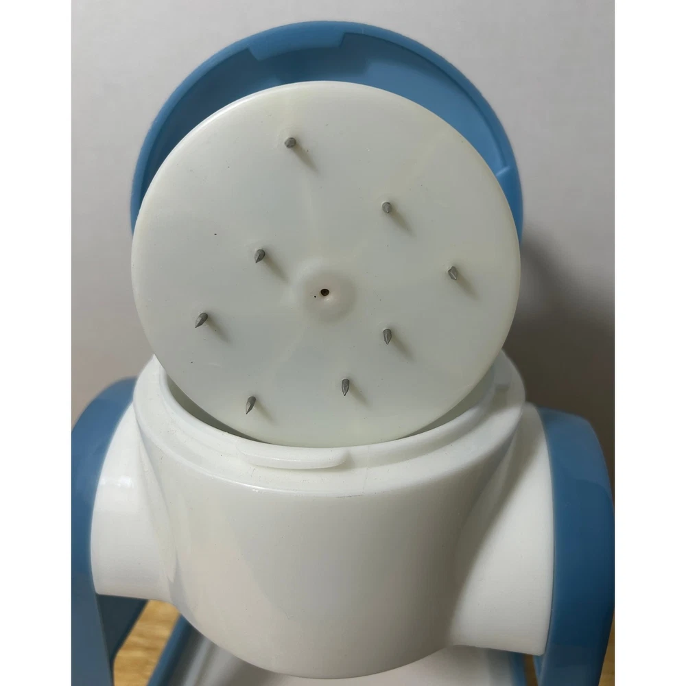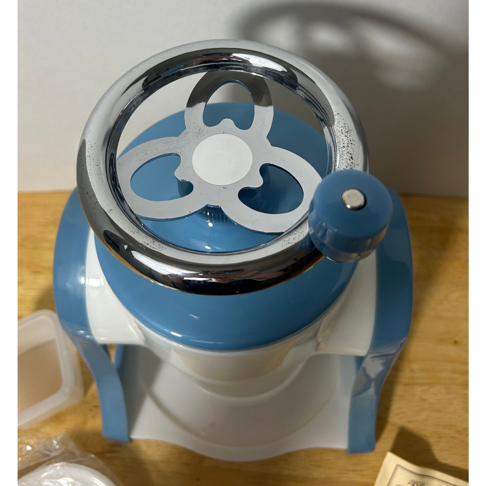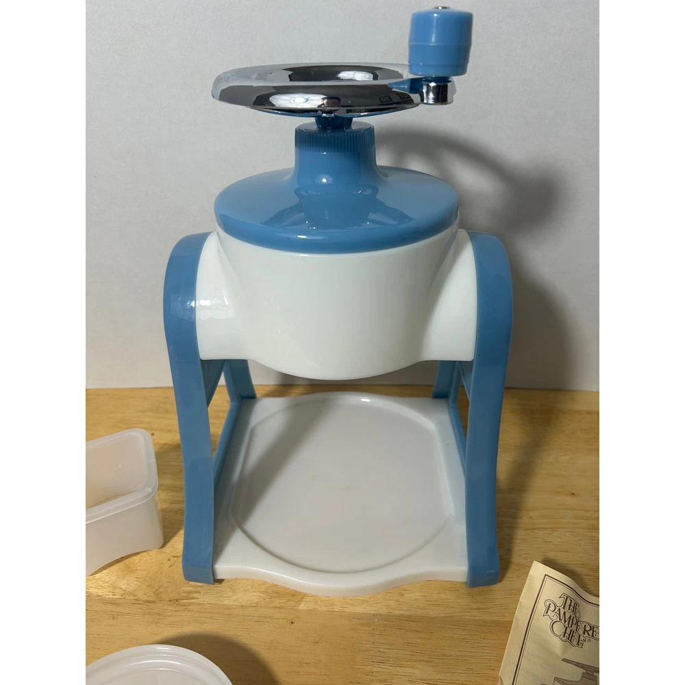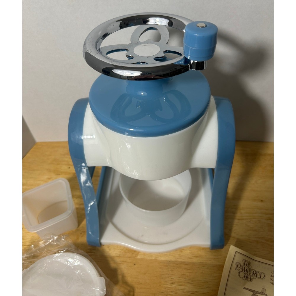 This vintage Pampered Chef Ice Shaver is a unique, hand-cranked kitchen tool that produces fluffy shaved ice for your favorite frozen treats. Standing 12.5" tall and 8" wide, this ice shaver comes with all its original components: the base, handle, ice mold, collection bowl, and instruction manual. It’s in excellent, pre-loved condition, showing minimal wear and ready to use. The charming blue-and-white design adds a retro touch to your kitchen. This set includes 3 ice mold discs and a small square container, ensuring you’re fully equipped for summer fun. Whether you’re making snow cones, frozen cocktails, or slushies, this shaver will help you achieve smooth, finely shaved ice in no time. Please note, this item is pre-loved and may have minor imperfections not otherwise noted in the description.