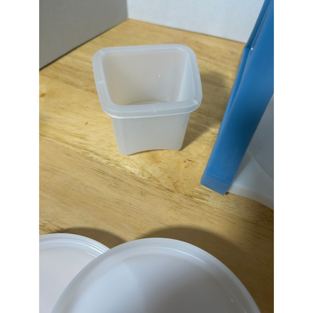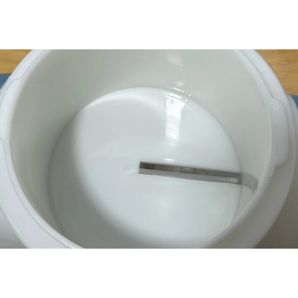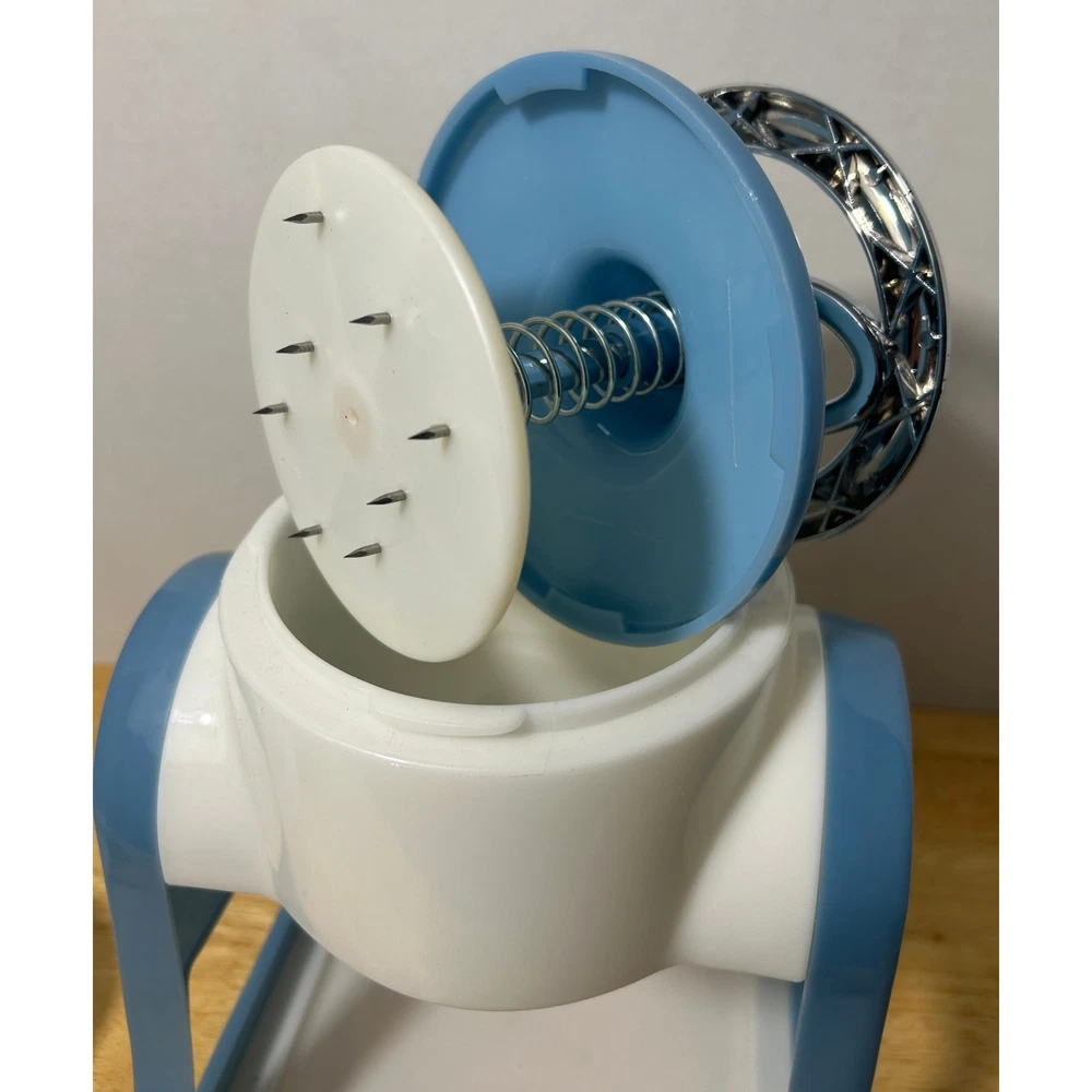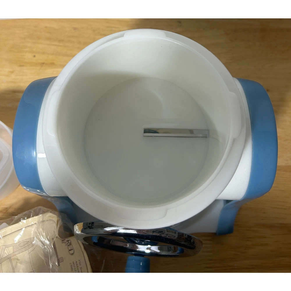 This vintage Pampered Chef Ice Shaver is a unique, hand-cranked kitchen tool that produces fluffy shaved ice for your favorite frozen treats. Standing 12.5" tall and 8" wide, this ice shaver comes with all its original components: the base, handle, ice mold, collection bowl, and instruction manual. It’s in excellent, pre-loved condition, showing minimal wear and ready to use. The charming blue-and-white design adds a retro touch to your kitchen. This set includes 3 ice mold discs and a small square container, ensuring you’re fully equipped for summer fun. Whether you’re making snow cones, frozen cocktails, or slushies, this shaver will help you achieve smooth, finely shaved ice in no time. Please note, this item is pre-loved and may have minor imperfections not otherwise noted in the description.