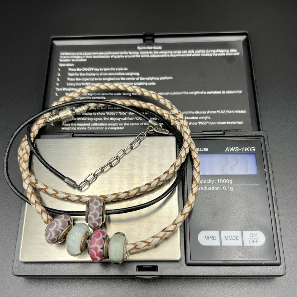 A huge find for Pandora collectors! 2 leather cords with sterling clasps and 5 Murano glass beads. ALL signed with the Pandora and the S925 ALE hallmark. Sellers best guess of age of components is around 2010. Modern Pandora beads may not be compatible with these vintage pieces. Please review photos carefully; they are considered part of the description. Photos may be enhanced to show detail. Priced to move quickly! Bid now!