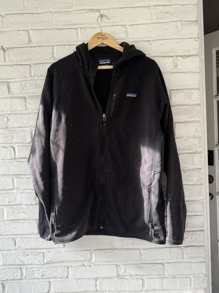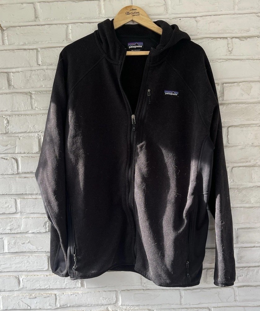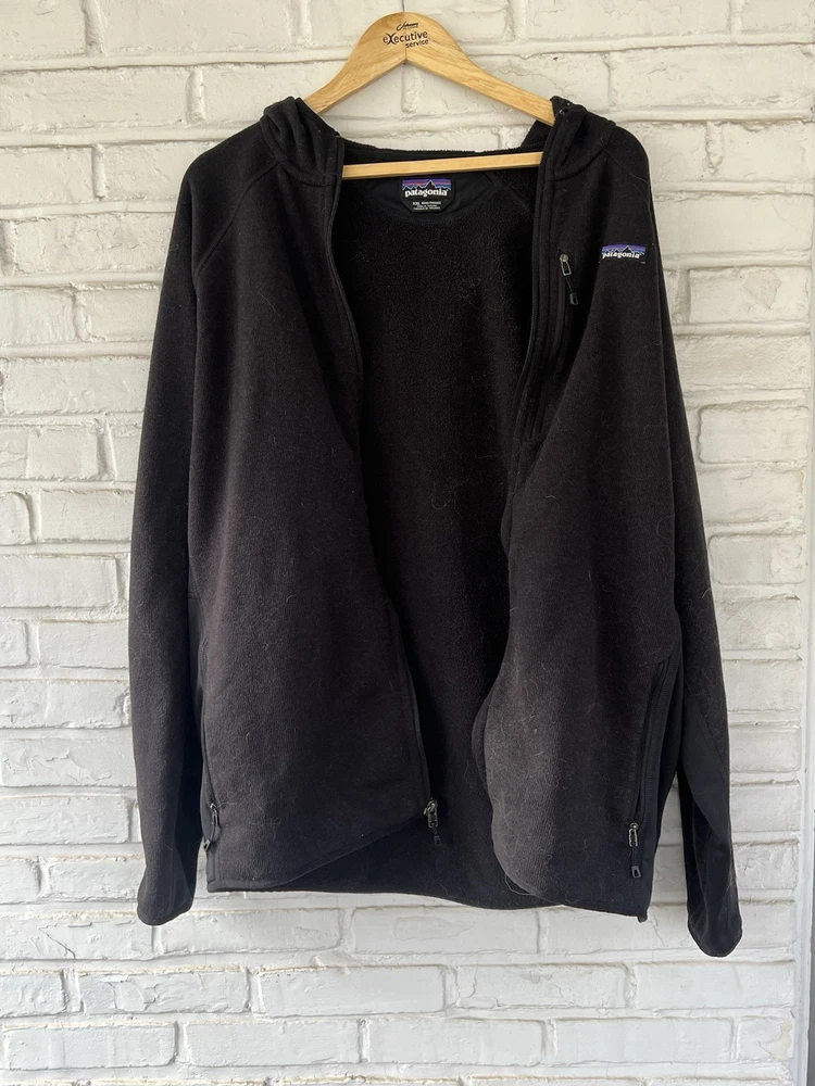 The product is a vintage Patagonia black fleece jacket in men's size XXL. This long overcoat features a zip closure and is made of polyester fleece fabric, making it cozy and comfortable for colder weather. The classic black color and iconic Patagonia branding give it a timeless and stylish look perfect for any casual or outdoor setting. Ideal for those looking for a warm and versatile jacket with a vintage flair.