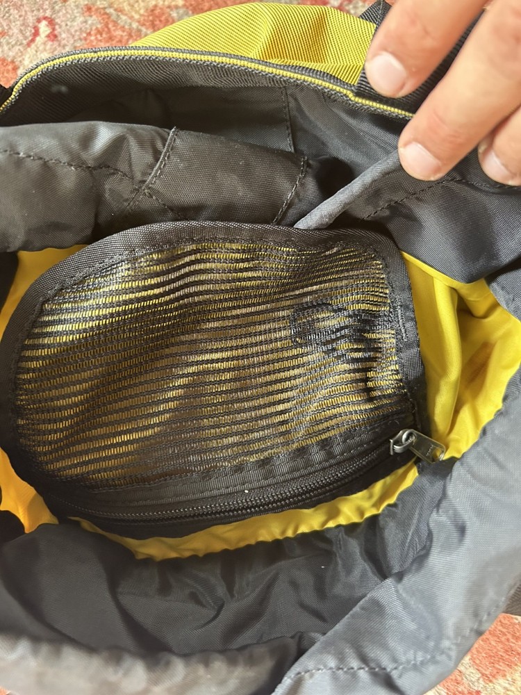 A vintage Patagonia climbing or work pack of some sort. Not much I could find on an exact model, but likely from the late 90s or early 00s. It looks like it might be a climbing pack that you could clip to an anchor. Shoulder straps retract into the top straps, which is a cool design. There is a slot that you can put rope through for a hip belt. In really great condition, kept in a box for a long time and likely never saw the light of day. I would guess maybe 15-20L of capacity.There are no visible tags I could find to confirm a year.