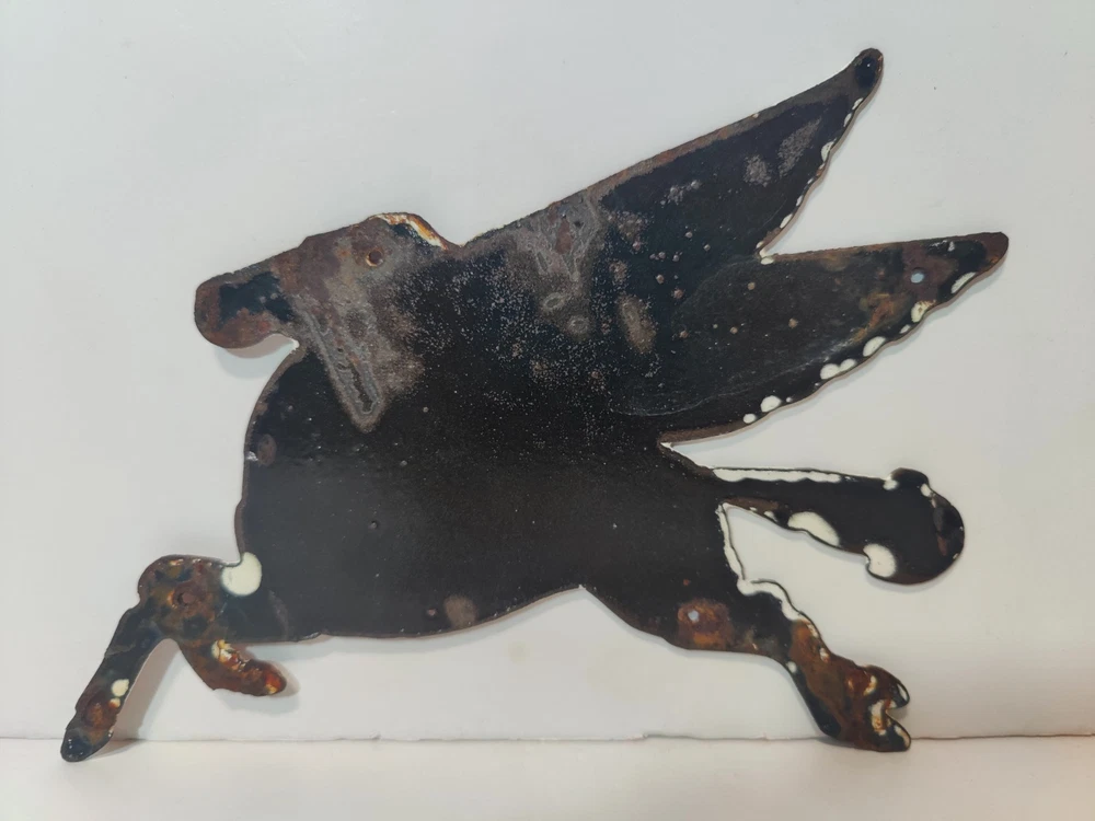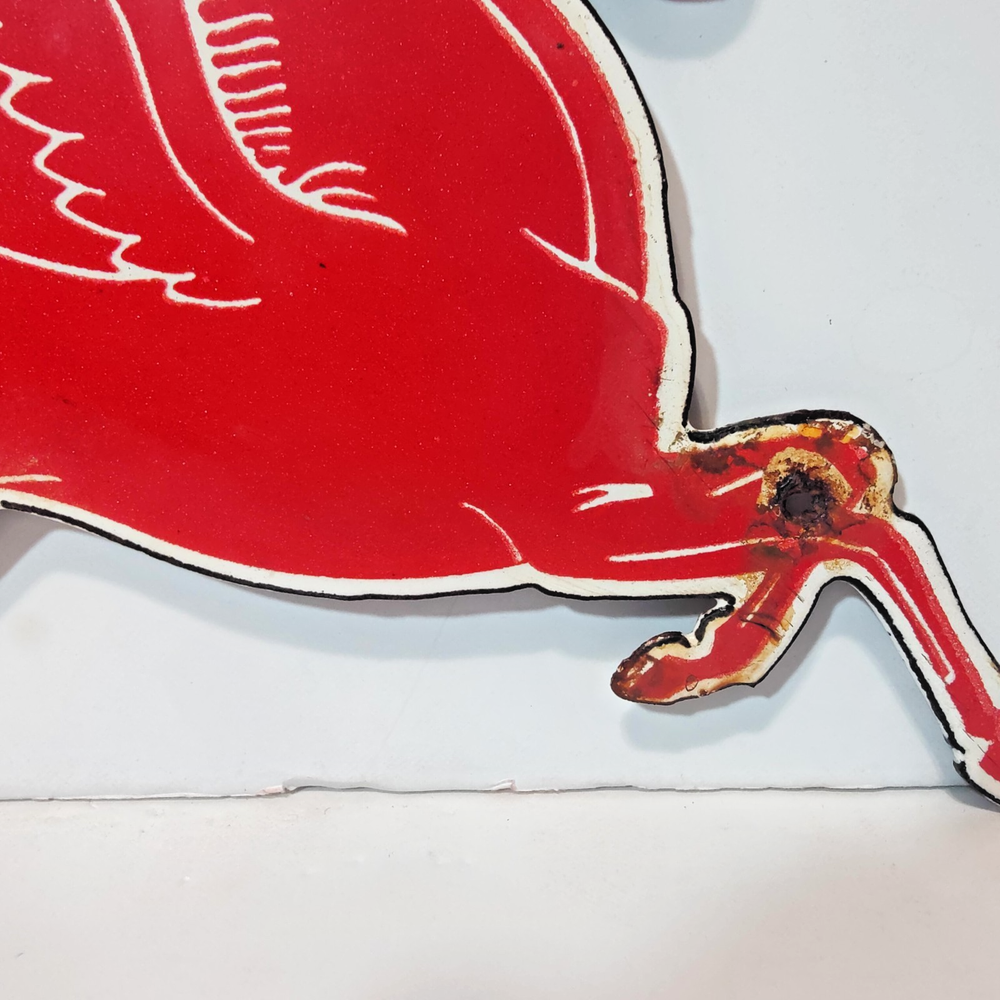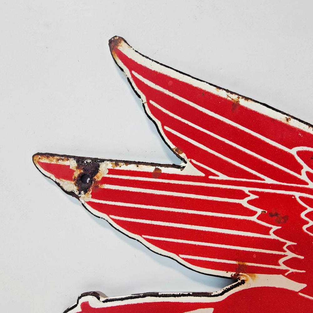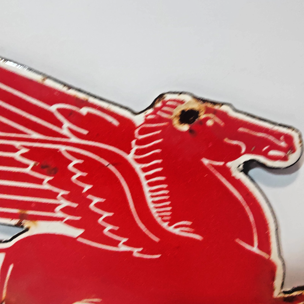 Capture a slice of history with this authentic Pegasus Red Horse Porcelain Enamel Metal sign, measuring a charming 9" x 5" inches. It's a genuine piece of Americana, representing the vibrantGas & Oil theme with its rich, red color and classic design. Originating from the United States, this sign is a testament to the enduring legacy of vintage advertising. Whether you're a collector of original signs or an enthusiast of unique decorative pieces, this sign brings a touch of nostalgia to any space. Its porcelain enamel construction ensures durability, while the intricate details preserve the allure of a bygone era. Display this emblem of the Pegasus brand and add an authentic vintage accent to your home or garage. * Kindly take a close look at all photos - they show the exact vintage sign you'll receive. What you see is truly what you get. * Carefully packed to protect the signs condition and shipped securely with USPS Ground Advantage
