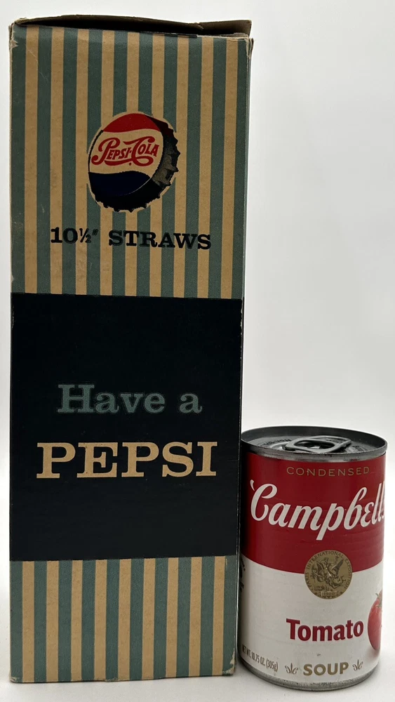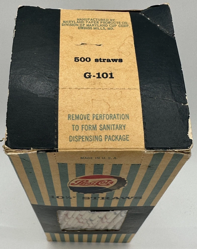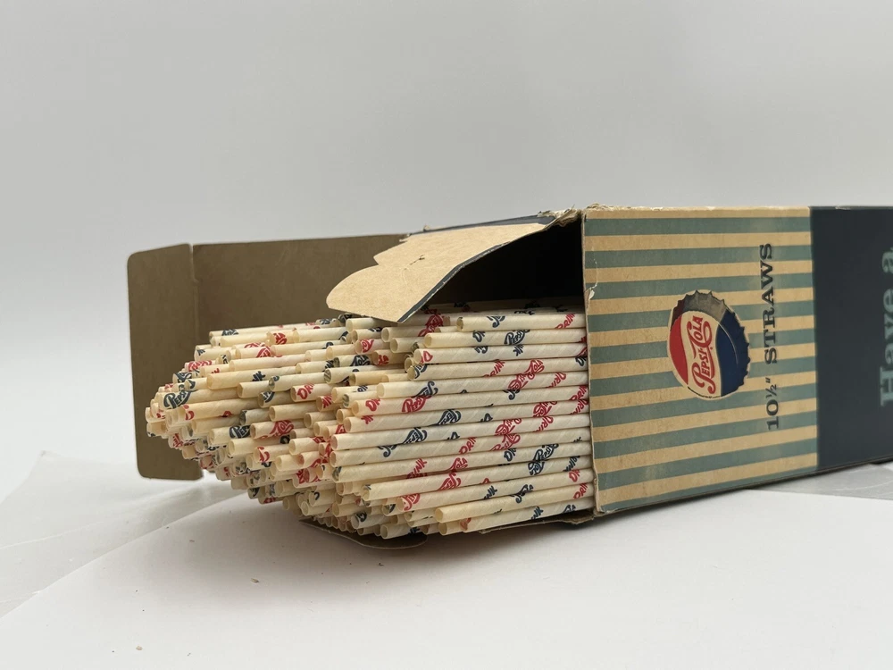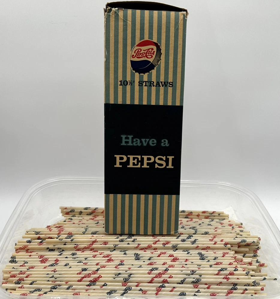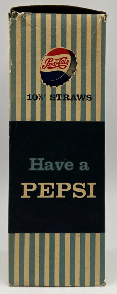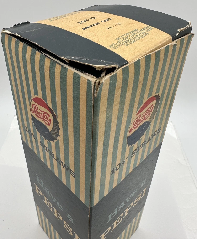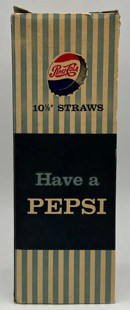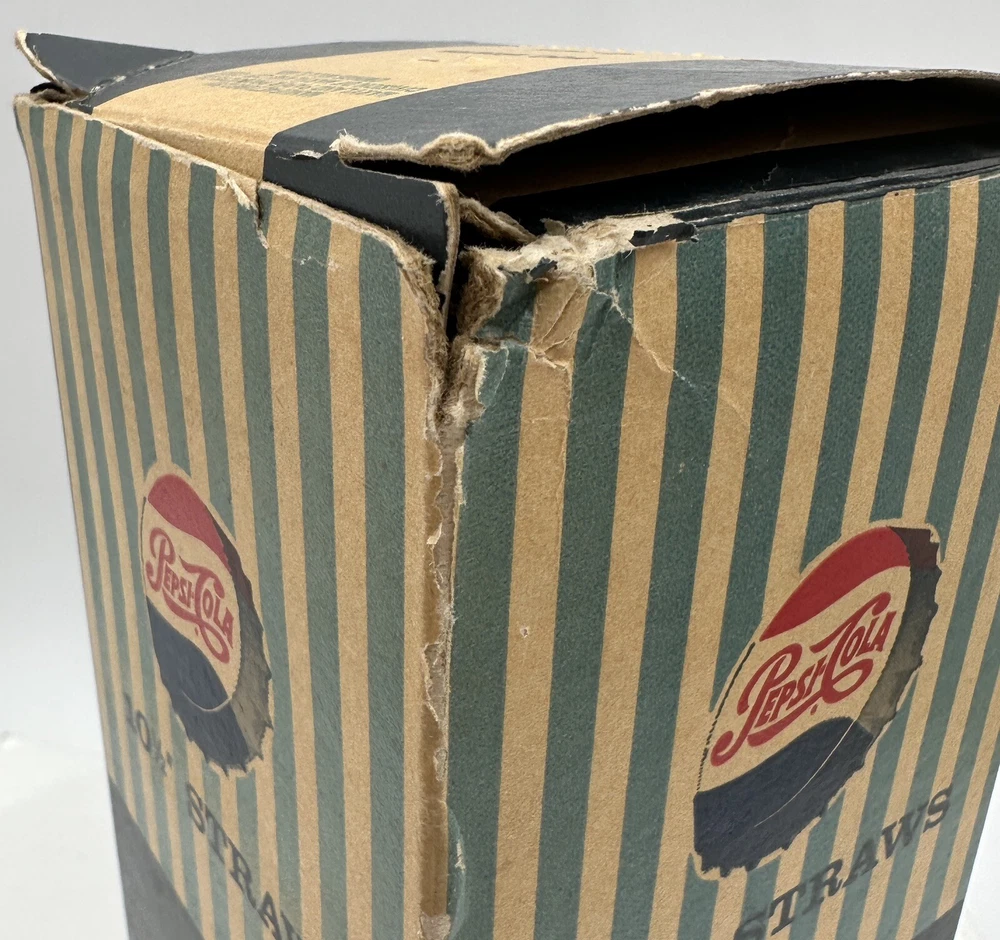 Box measures approximately 3 3/4 inches square and and 10 7/8 inches tall. Package contains approximately 320 vintage new old stock Pepsi Cola straws. Box shows storage wear as seen in pictures. Thanks for looking and happy buying! Follow this link to see all our ADVERTISING listings!