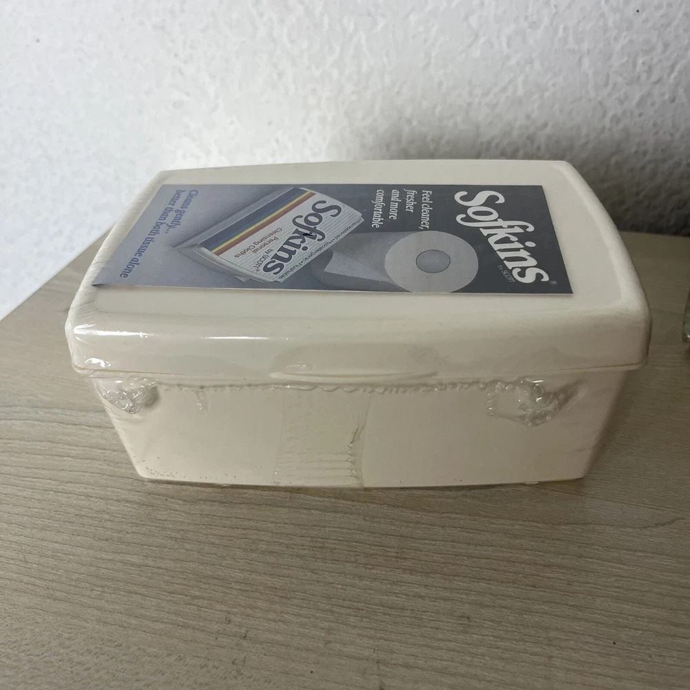 From 1988 sealed in package. There's some discoloration, in particular on the bottom, some of which may have gone through the seal to the plastic box 48 personal cleansing cloths in a plastic container box More than likely these are dried out inside ------- This vintage plastic container from Scott Paper Co. is a must-have for collectors of health and beauty advertising. The container is marked with the Sofkins Personal Flushable logo and is an original piece. The white color of the container adds to its aesthetic appeal. This item is perfect for those interested in the history of advertising and the beauty industry. It was made in the United States and is a rare find. The plastic box type of advertising is unique and adds to the overall charm of the item. Add this to your collection of other health and beauty ads, health and beauty items, or advertising memorabilia today.