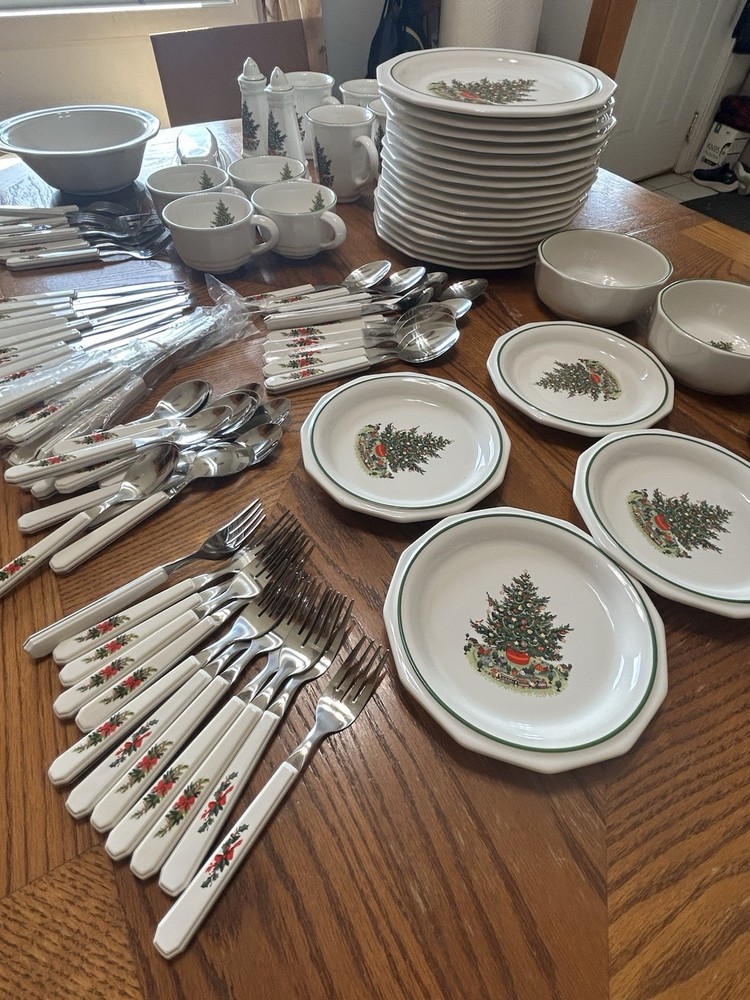 The Vintage Pfaltzgraff Collector Collection "Christmas Heritage" Dining Set is a festive and charming addition to any dining room during the holiday season. Made of durable stoneware and ceramic materials, this multicolor dining set features a Christmas theme that adds a touch of nostalgia to your holiday gatherings. With its classic design and American craftsmanship, this collection is sure to bring joy and warmth to your dining experience. Perfect for celebrating special occasions or everyday meals, this dining set is a timeless treasure that will be cherished for years to come. This set includes: 16 dinner plates 4 salad plates 4 bowls 4 mugs 4 saucers 1 serving bowl 1 salt and pepper set 1 butter dish Silverware includes: 12 large spoons 12 small spoons 12 large forks 12 small forks 12 knives 8 serrated steak knives