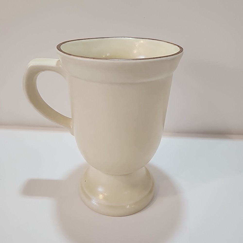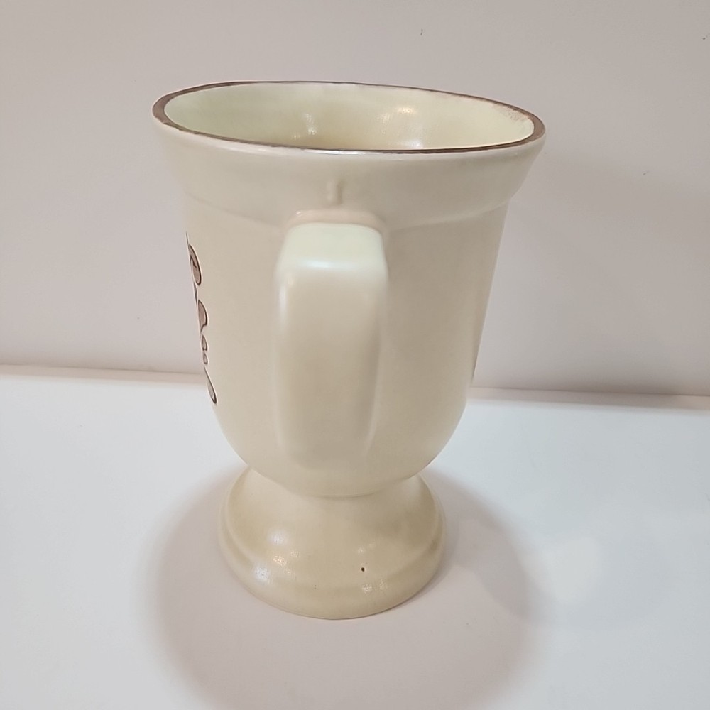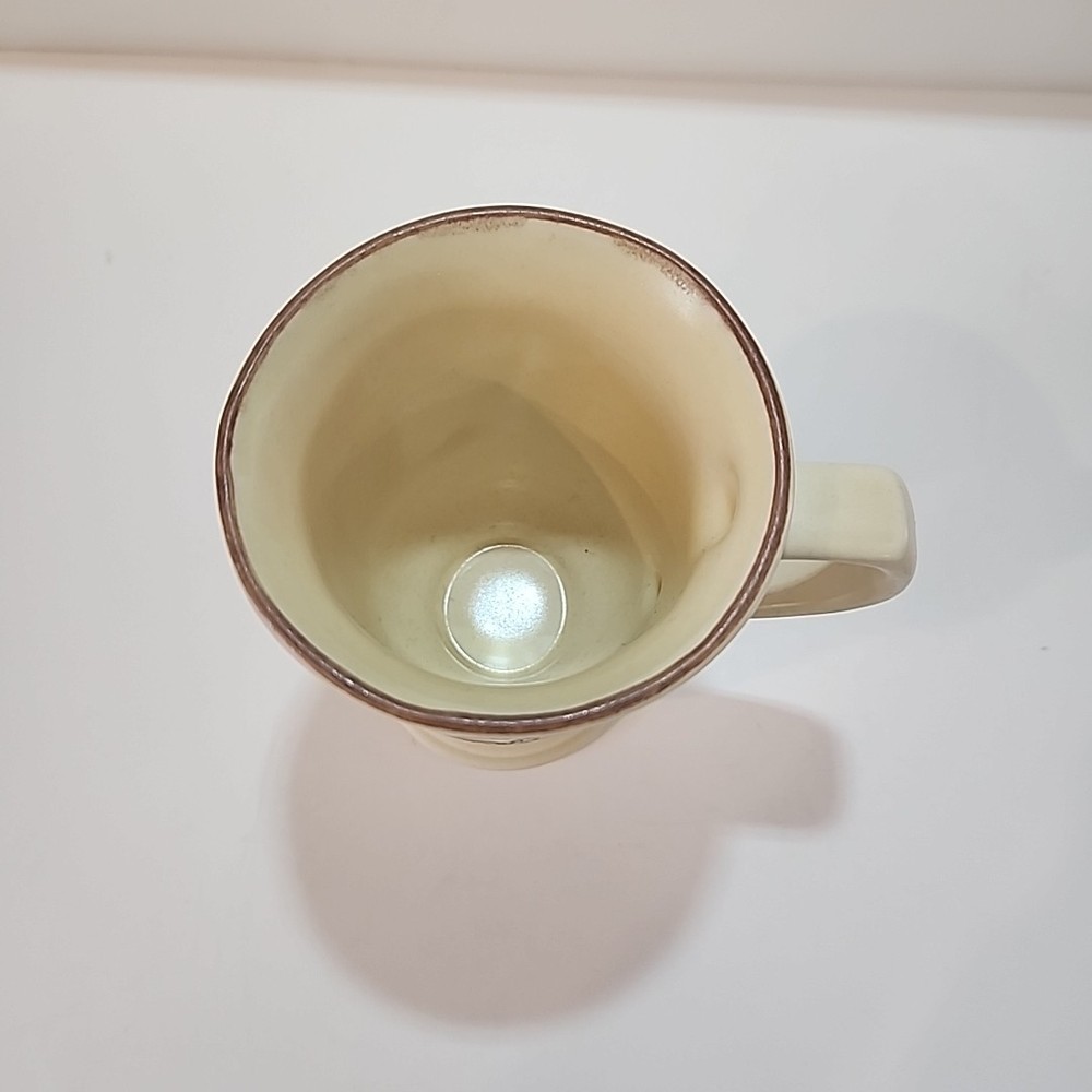 The vintage Pfaltzgraff Village Irish Coffee Mug is a vintage stoneware coffee mug featuring a cream tan and brown color with a floral pattern. It has a diameter of 3 1/2 inches, a height of 5 1/4 inches, and a capacity of 10 ounces. This original Pfaltzgraff piece from the 1970s is microwave and dishwasher safe, making it a practical and decorative addition to any household. Crafted in the United States using pottery techniques, this contemporary style mug is perfect for all occasions and suitable for both men and women. Made in the USA. A small chip or defect at the base as shown in last picture. Please see all pictures and zoom in for a good look at this item.
