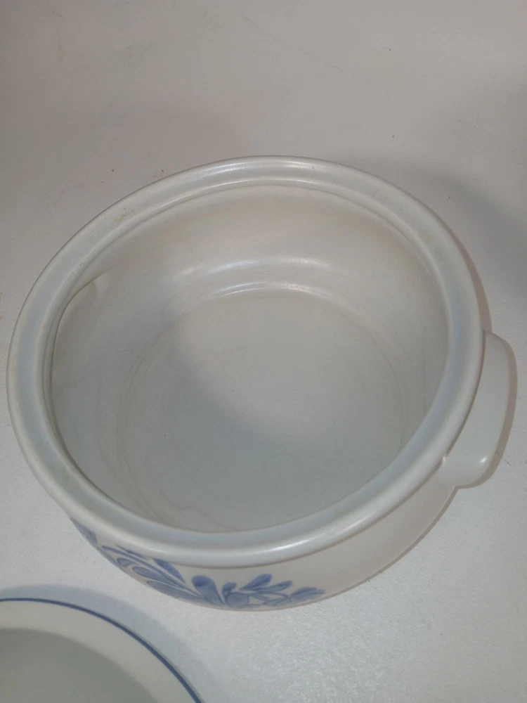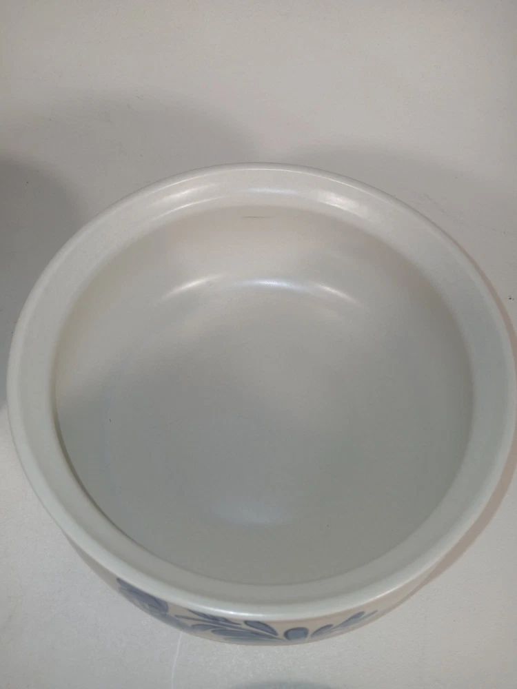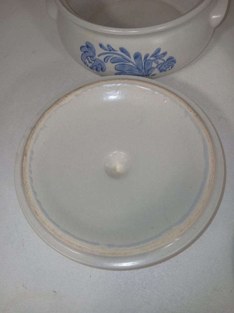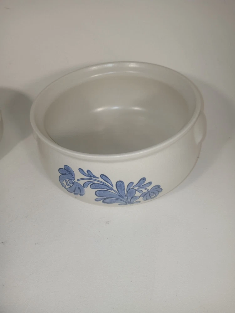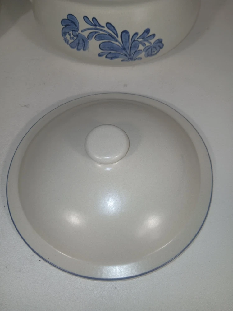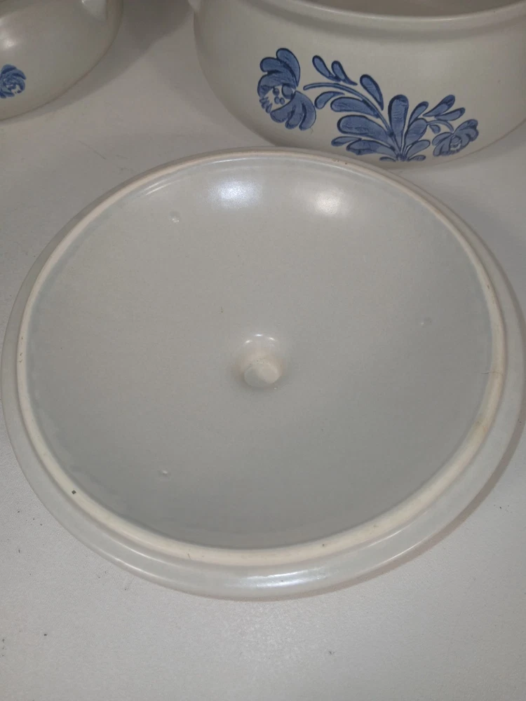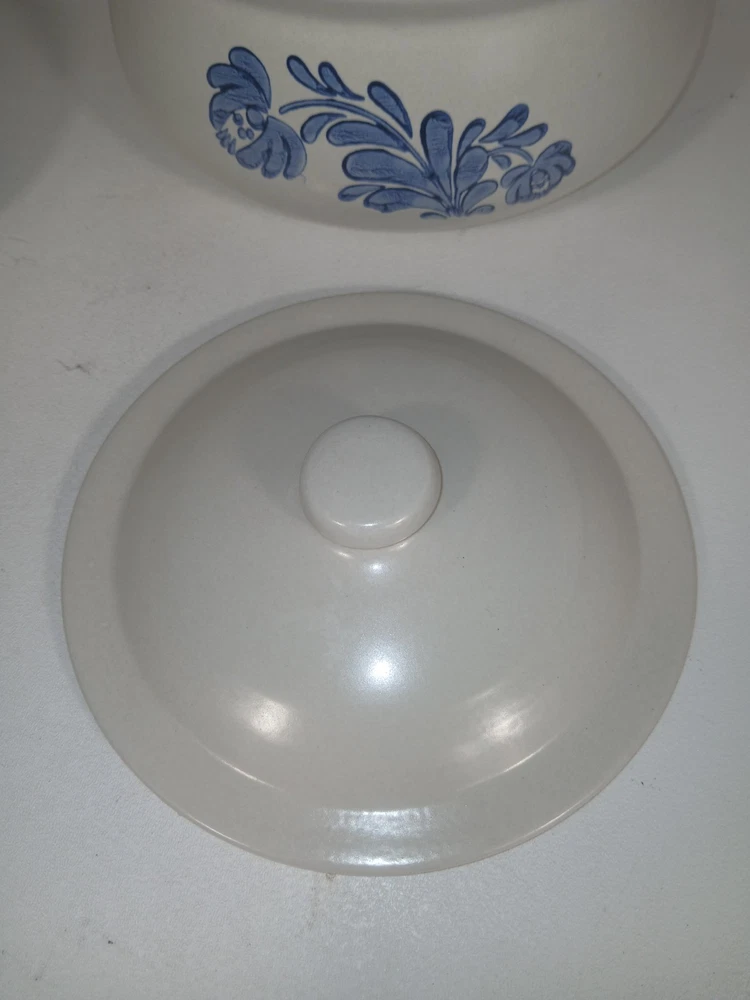 This set includes a 2 QT and Rare 3 Qt covered casserole dish by Pfaltzgraff in the Yorktowne pattern. The casserole dishes feature a gray color and come with lids for easy storage and transport. These vintage original pieces from the Pfaltzgraff Yorktowne 315Y and c3 model are both functional and stylish, making them a great addition to any kitchen or dining room. very few 3 qt out there. $165 listed used very small chip on lid on smaller one (see photo) couple marks / smudges on each each has mfg imprerfections in color, there is a small bubble, imperfection 1/16 inch on bigger one on left side under emblem see photo emblems show bit of wear esp on smaller one. wear on bottom on jars