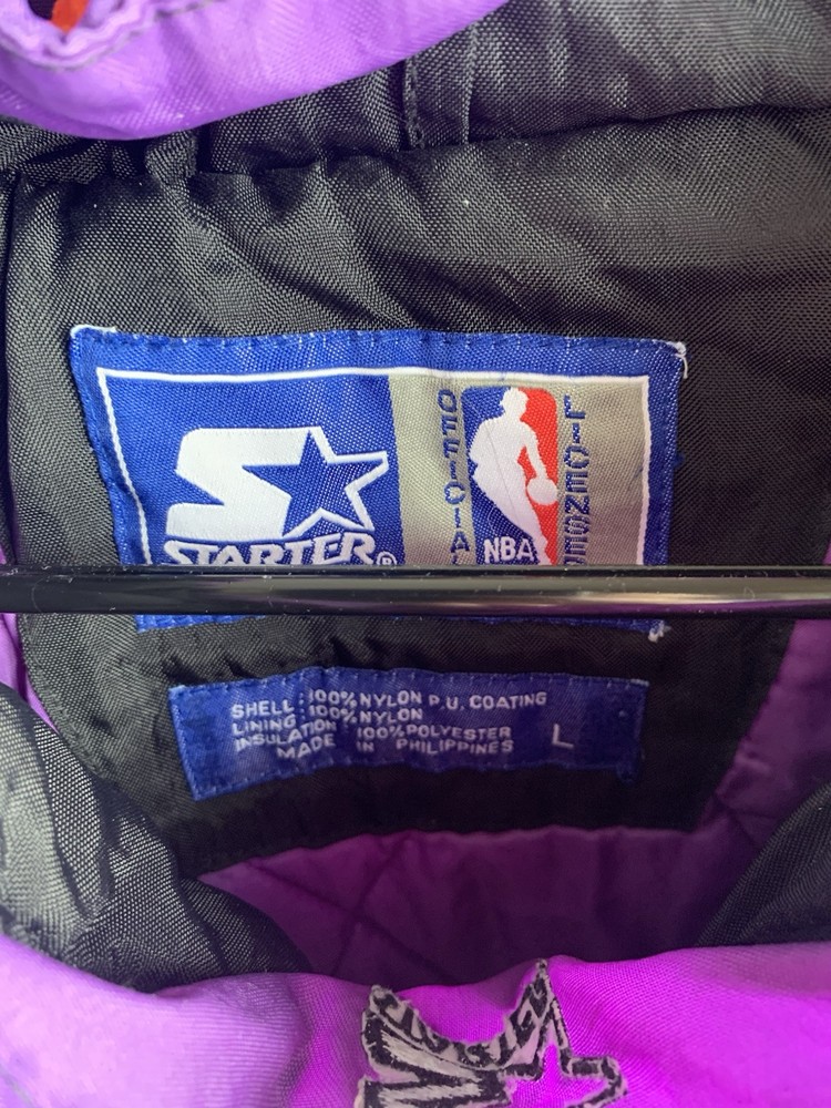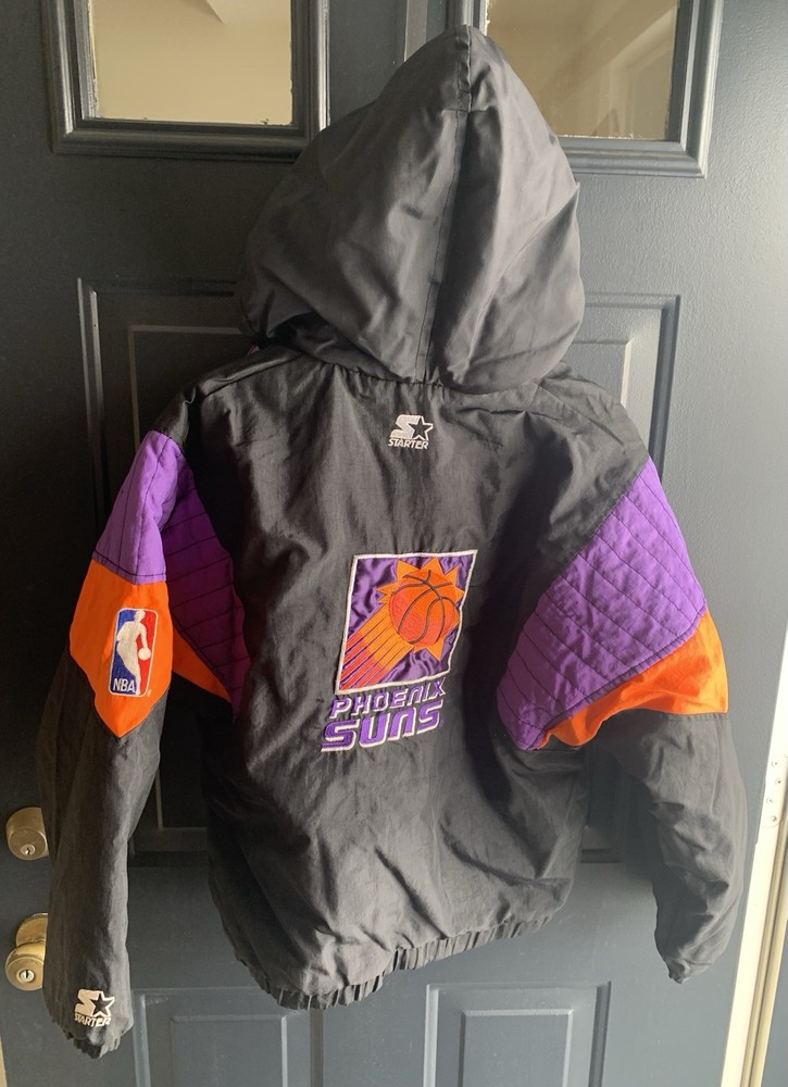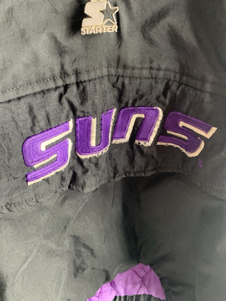 Embrace the vintage appeal with the Phoenix Suns Starter Puffer Jacket, a must-have for any die-hard basketball fan. This classic black jacket, adorned with the iconic Suns logo and colors, represents a timeless piece of sports memorabilia. Sized large, it's tailored for a comfortable fit that's just right for game days or casual outings. Crafted with quality in the Republic of Korea, this jacket is not just a collector's item but also a functional piece, perfect for those who value both style and practicality. The jacket is officially licensed by the NBA, ensuring authenticity, and it celebrates the legendary Charles Barkley, a key figure in Phoenix Suns' rich basketball history. Message me with any questions or if you want measurements! Fits smaller than a large
