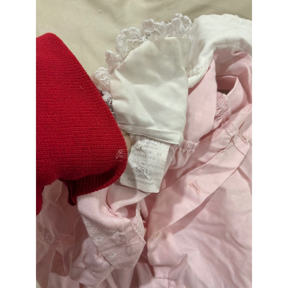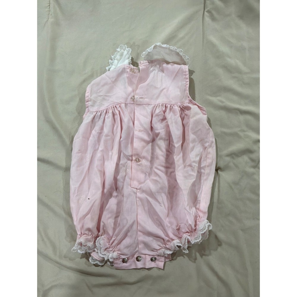 Vintage pink bubble romper showcases a delicate white Peter Pan collar with floral embroidery and lace trim. Crafted from a soft cotton blend with a subtle self-patterned weave, this sleeveless piece includes a gathered waist for a voluminous silhouette and lace-edged leg openings. Functional details include a button-down back and snap closures at the bottom for easy dressing, making it a charming choice for special occasions or classic everyday wear. Measurements: • Chest: 10" (20" doubled) • Length: 15"