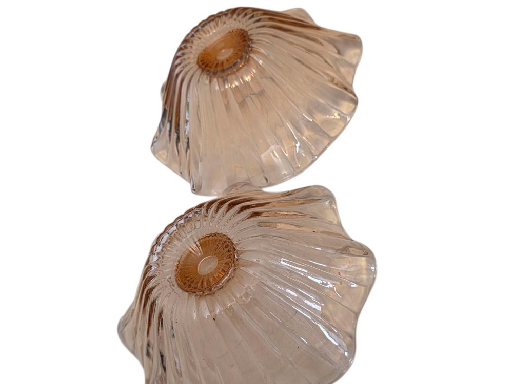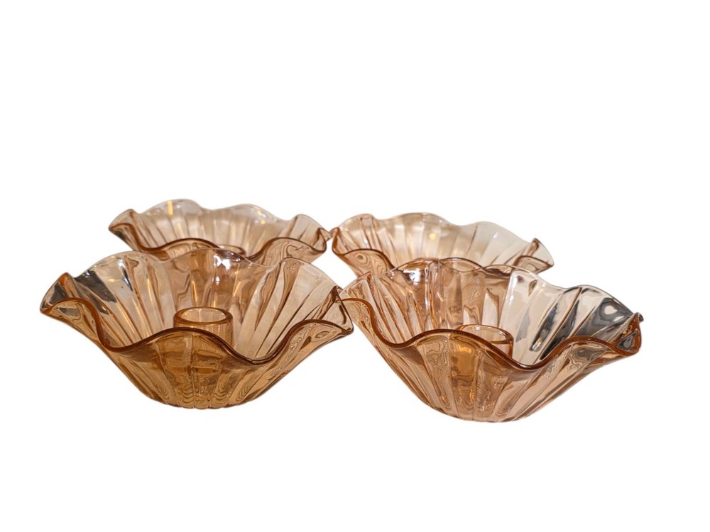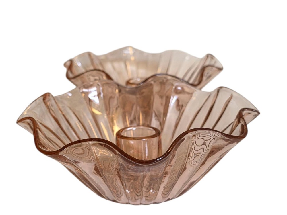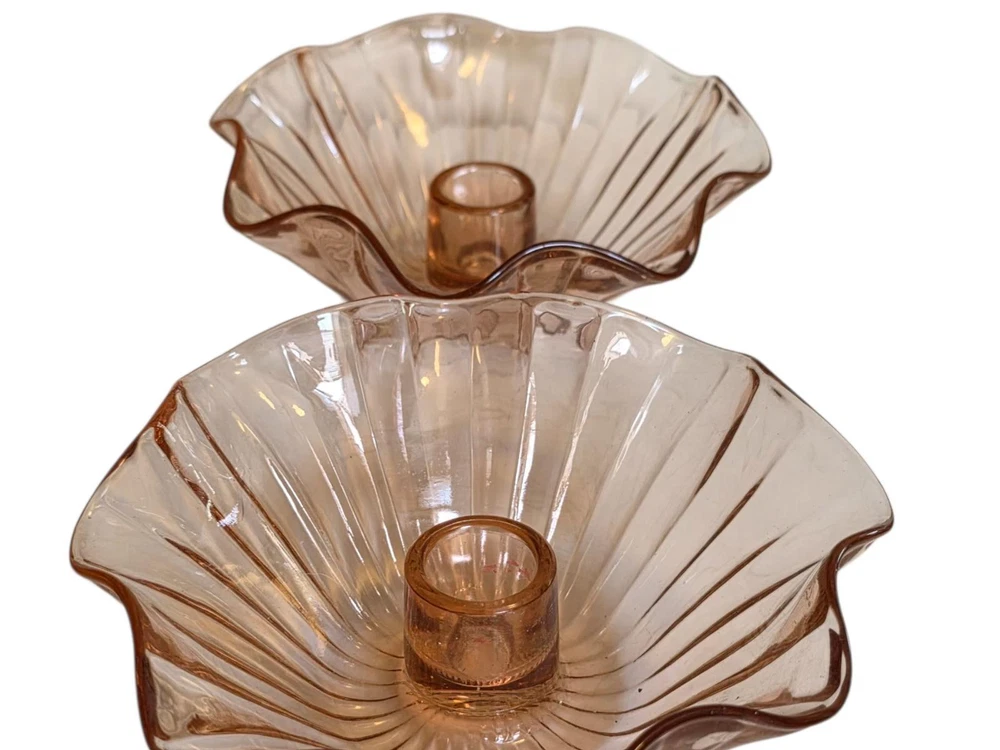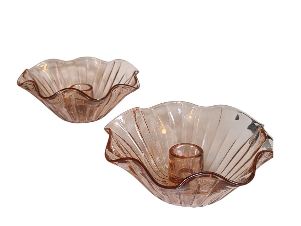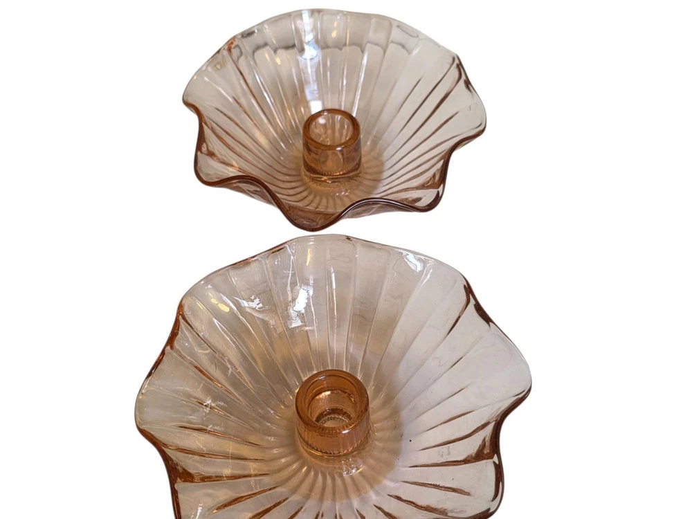 Set of 4 Vintage Pink Depression Glass Candlestick Holders – Fluted Fan Shell Design Add a touch of vintage charm to your space with this beautiful set of 4 pink Depression glass candlestick holders. Featuring a scalloped fan or shell-like shape with a ribbed design and central taper candle holder, these delicate pieces are perfect for Art Deco lovers or Depression glass collectors. Details: Quantity: 4 candlestick holders Color: Soft pink Material: Depression glass Style: Fluted fan/shell with ribbed detailing Condition: Excellent vintage condition – no chips or cracks
