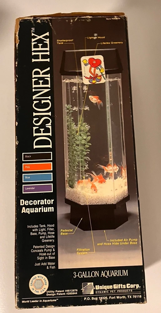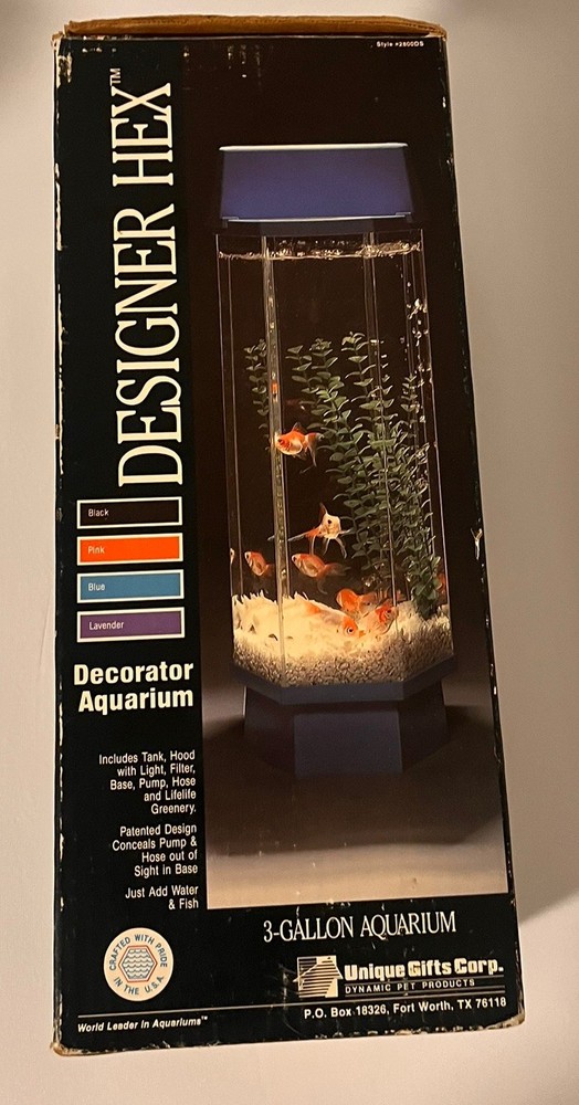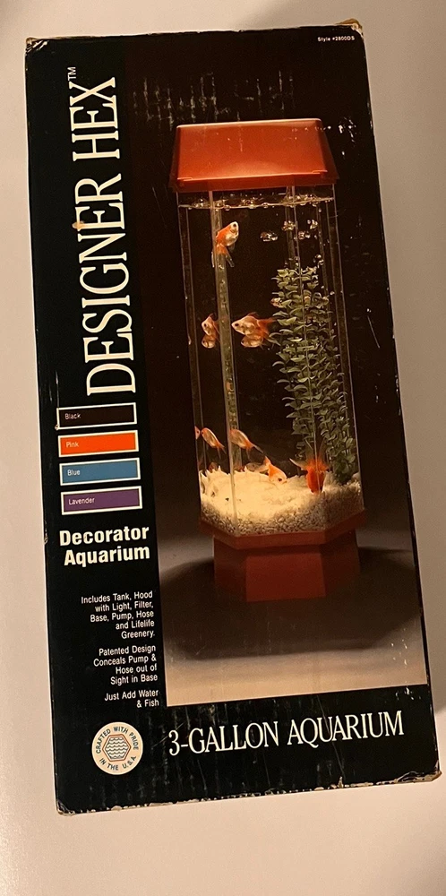 Open box works great everything this is the pink one from 1983 The Vintage Designer HEX Aquarium #2800ds Pink Hexagonal Decor Fish Tank is a unique and stylish mini aquarium designed by the brand Designer Hex. This retro-inspired fish tank features a hexagonal shape, a tank capacity of 3 gallons, and a tank width of 7 inches. Made of acrylic, this aquarium is perfect for fish lovers looking to add a touch of nostalgia to their home decor. Designed and manufactured in the United States, this one-of-a-kind tank is sure to stand out in any living space.