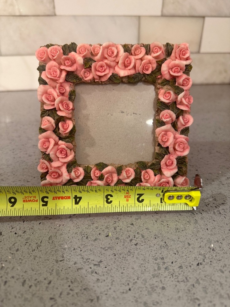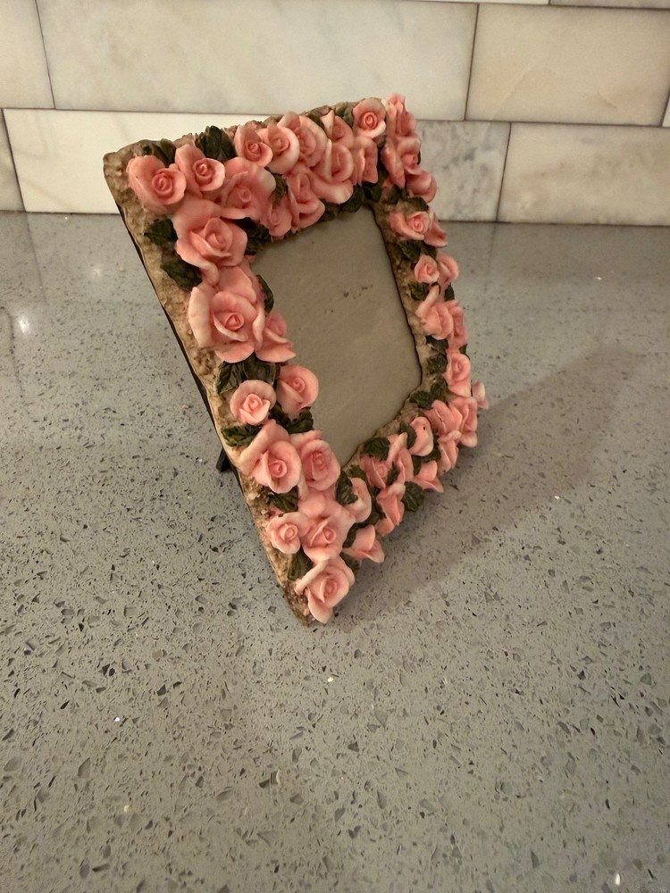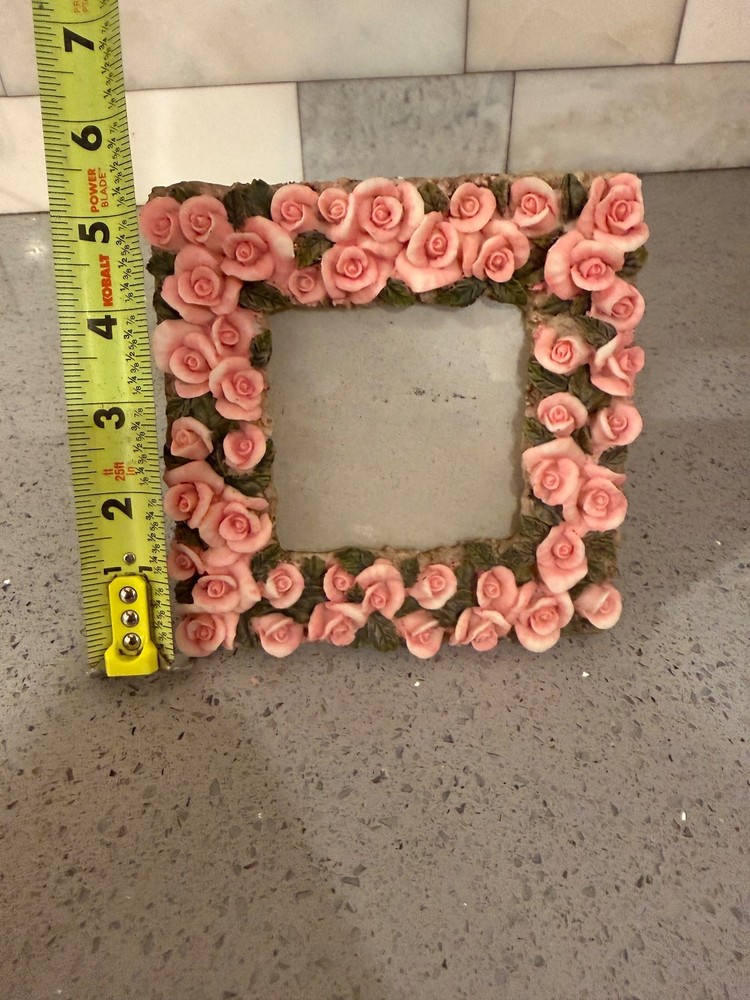 Add a touch of romantic vintage charm to your decor with this adorable ceramic photo frame covered in delicate 3D pink roses! This sweet square frame features dozens of hand-applied pastel pink roses with swirled centers, clustered all around the border and interspersed with green leaves for a lush, garden-inspired look. The three-dimensional roses give it amazing texture and depth—perfect for shabby chic, cottagecore, granny chic, or romantic nursery/vanity displays. - Overall dimensions → approximately 5" x 5" (outer); ideal for a small 2.5" x 3.5" wallet photo, 3" x 3" square, or even a pressed flower/art card (glass and backing included, easel stand on back for tabletop display). - Material → Ceramic/resin with a soft matte/glossy finish. - Condition → Excellent vintage condition—no chips, cracks, or major flaws; minor wear adds to the authentic retro appeal. Thrift-found gem, gently cleaned and ready for your favorite photo or keepsake! From the 1980-90s giftware era (similar to popular Chinese/Taiwan imports of the time), this frame screams nostalgic femininity and is hotter than ever in today's cottagecore trend. Ships carefully packaged to arrive safely. Feel free to message with questions—happy to send more photos! 🌸🖼️