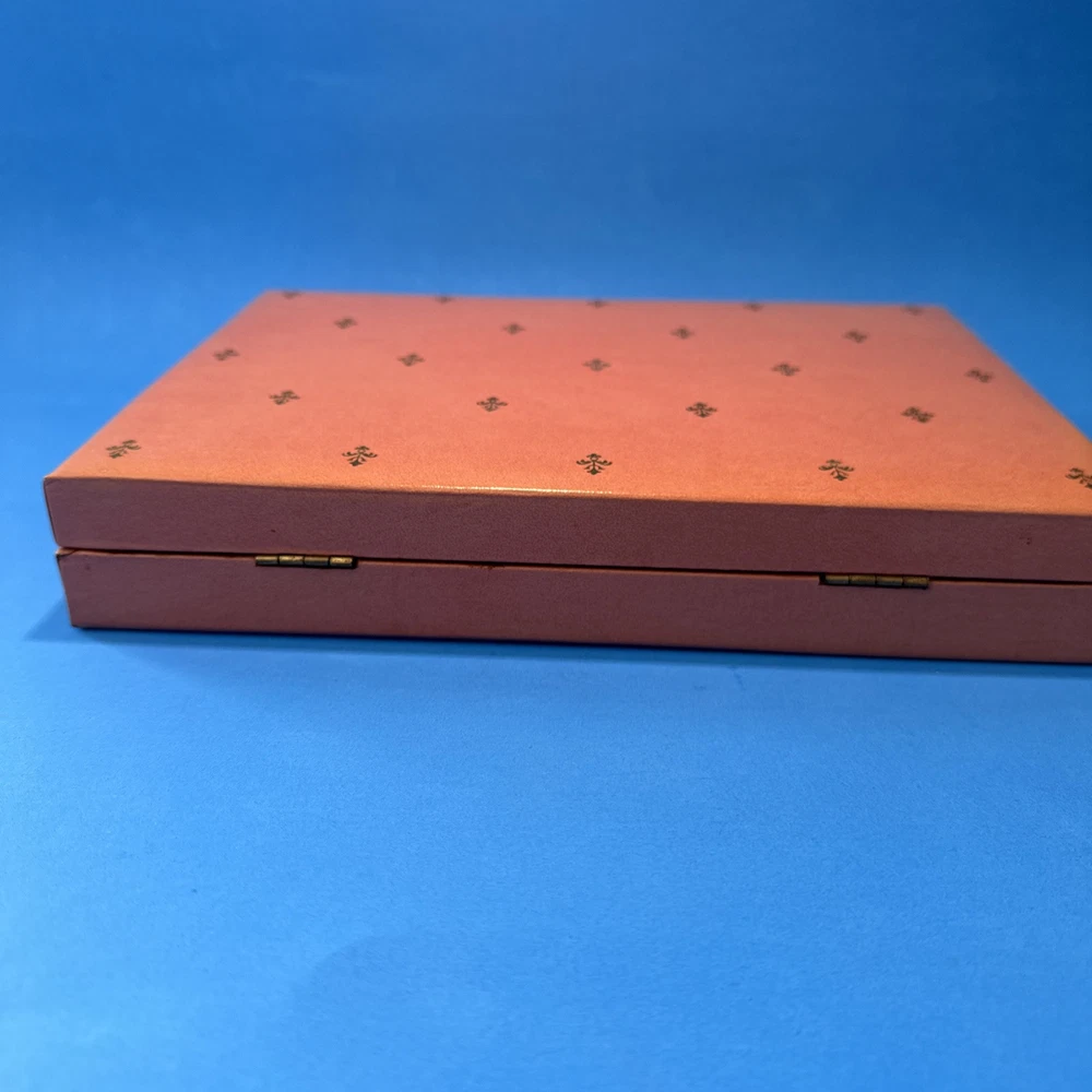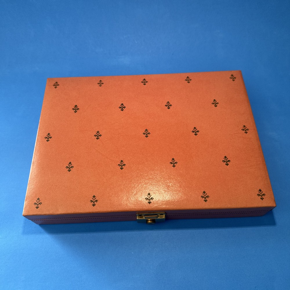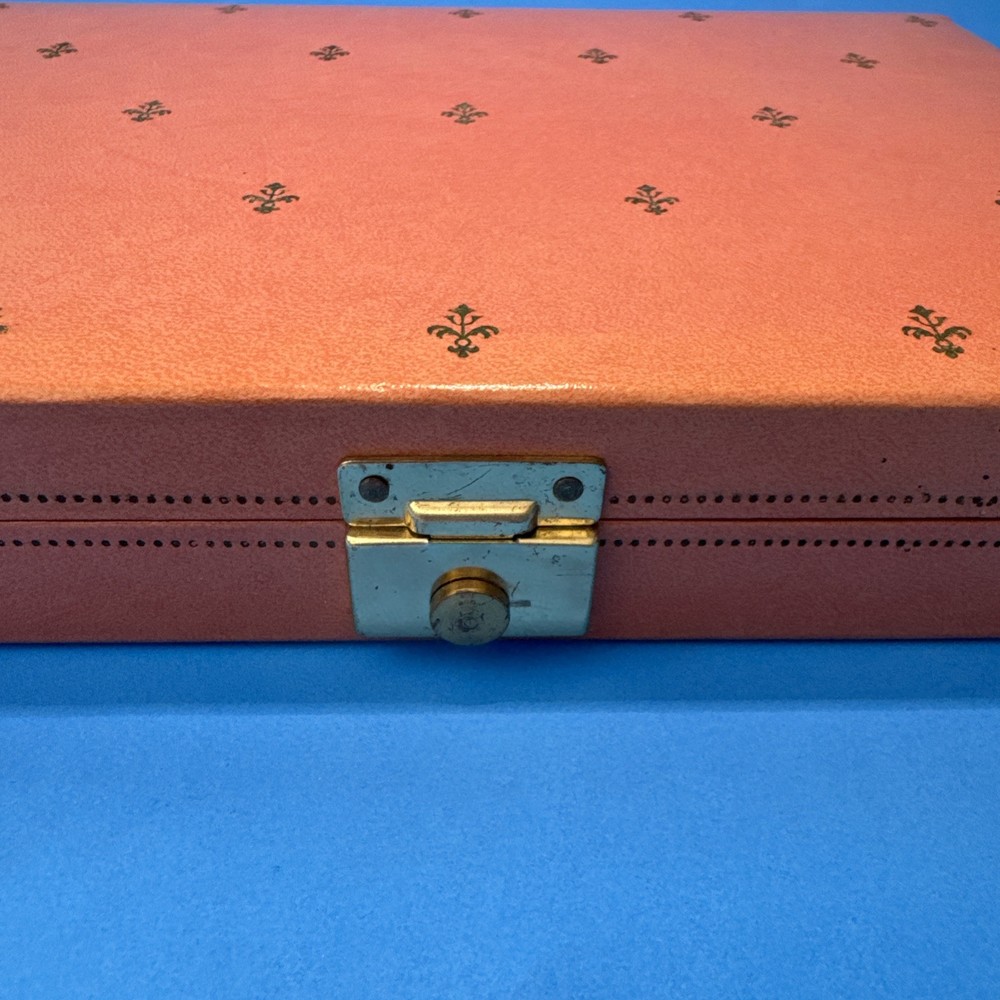 This vintage jewelry box by Mele is a stunning addition to any collection. The pink velvet exterior is beautifully designed with a bright fleur de lis pattern and a rectangular shape. The box is perfect for storing a variety of jewelry items, including necklaces, bracelets, anklets, rings, cufflinks, earrings, and body jewelry. The interior of the box is lined with soft velvet and includes several compartments to keep your jewelry organized. The box is also hinged, making it easy to access your items. Whether you're a collector or just looking for a stylish way to store your jewelry, this Mele vintage jewelry box is a must-have.