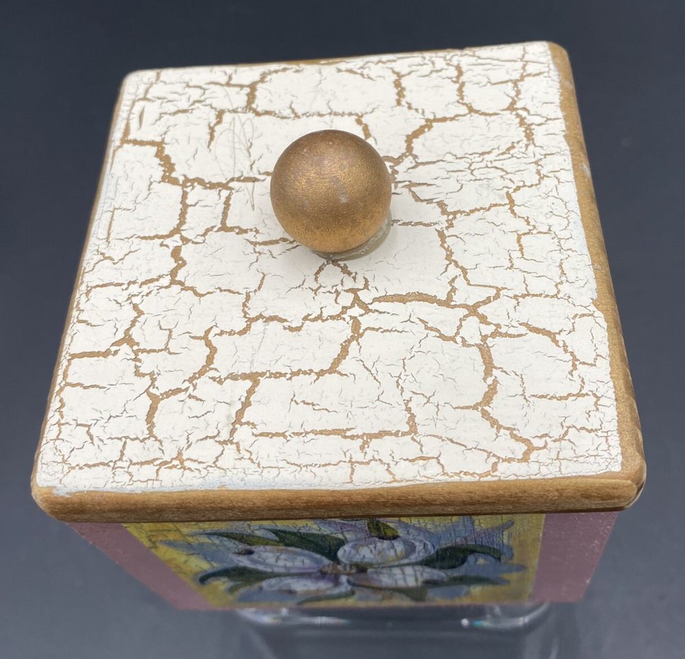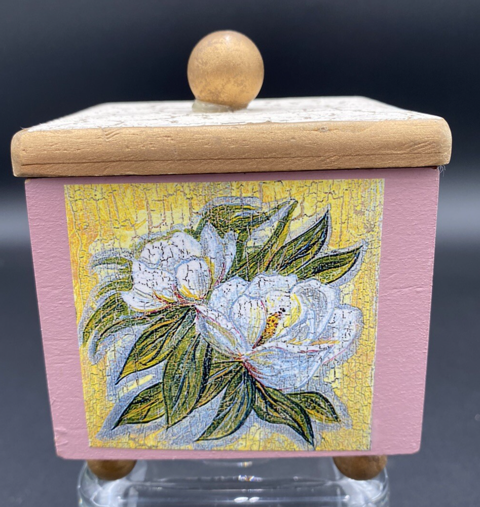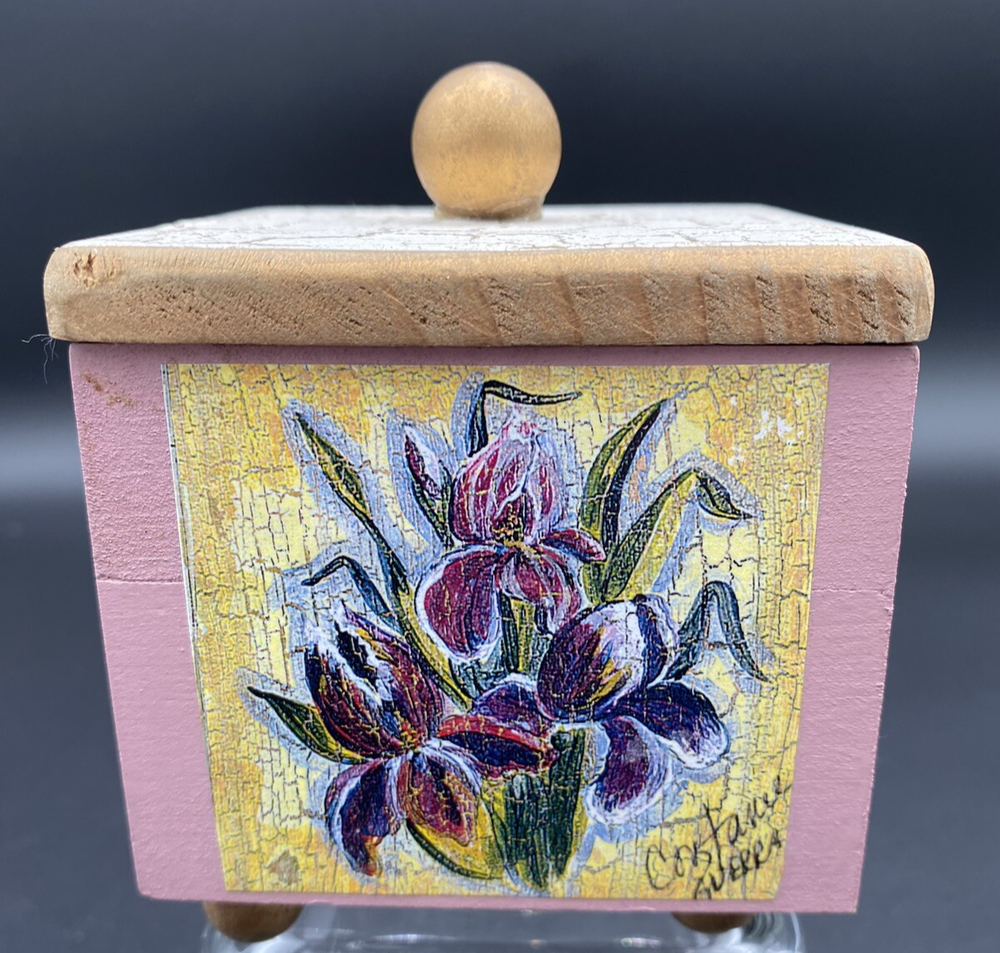 This vintage wooden keepsake box is a one-of-a-kind treasure designed by Constance A. Guerra. The front piece is a floral wreath surrounding the words, "Forever Friends". The other three sides are purple irises, dogwood blossoms, and white peonies. The lift-off top has a a gold and white crackle finish. It is perfect for storing small trinkets and mementos. The square shape and 4.5-inch height make it a charming and manageable addition to any room. Measuring 3.25 inches wide and weighing just 4 ounces, this box is both decorative and functional, featuring a friendship theme that's perfect for all occasions. The keepsake box is in very good condition. There are no chips, cracks or signs of wear.