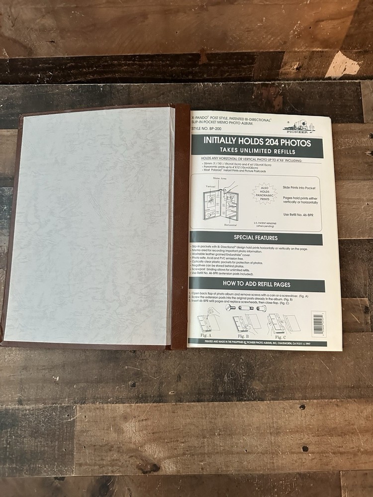 This post bound album features a durable leather-like cover and can hold a large number of 4x6 photos or panoramics. Washable and durable Endurahide leather-like book cover design with gold accents Bi-directional clear pockets hold either horizontal or vertical prints up to 4" x 6" or APS panoramics Shaded paper background to enhance photo. Location D9