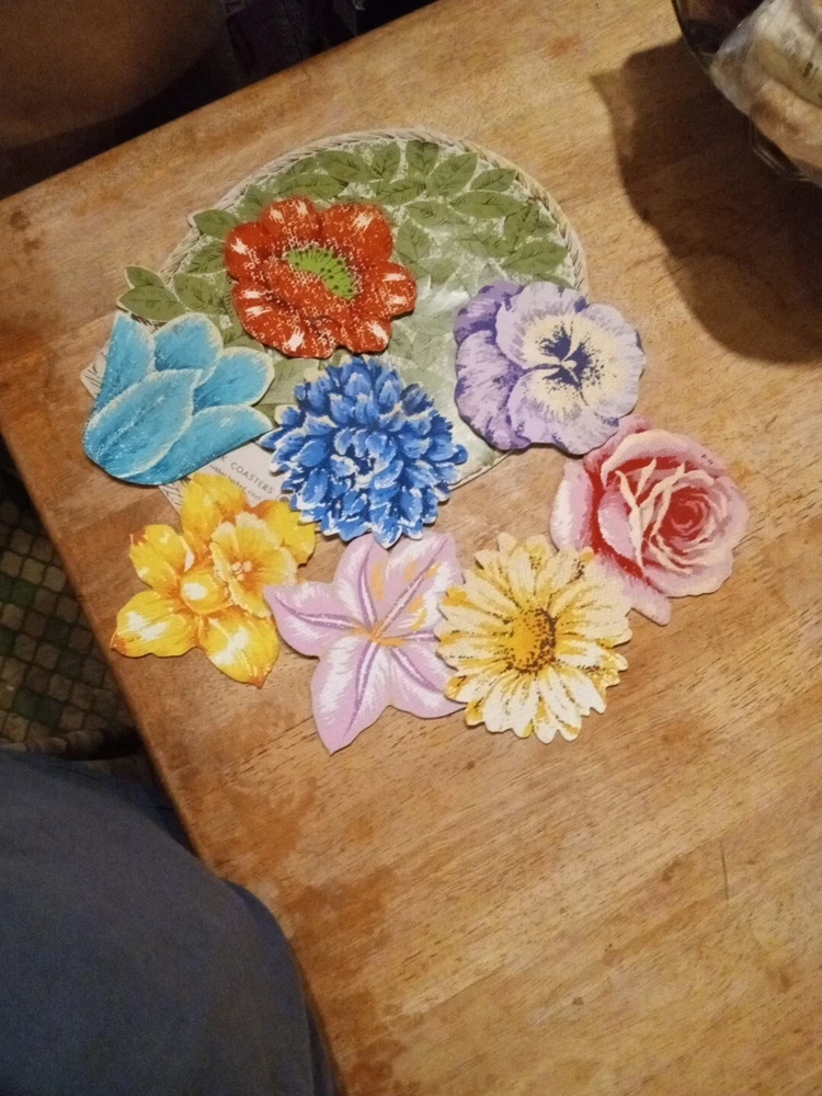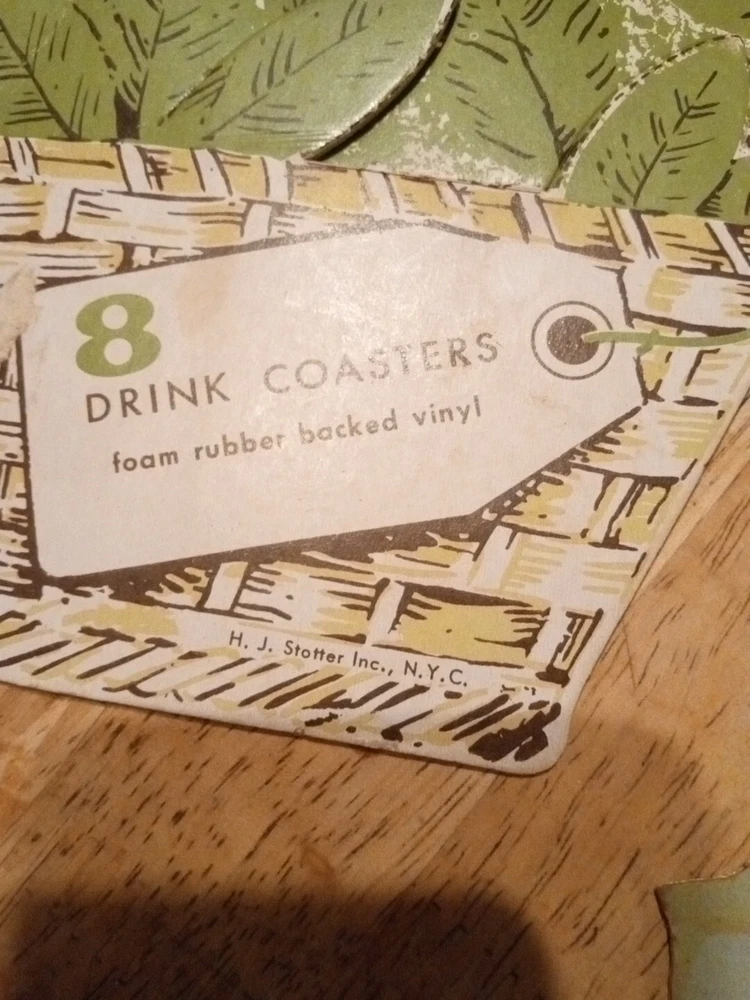 Shape:FLOWERSNumber of Items in Set:7Type:Drink Coasters/Furniture ProtectorsBrand:H.J.STOTTER INC. N.Y.C.Material:Plastic, Non-metallic Metal, VINYL WITH FOAM RUBBER BACKSColor:MulticolorPattern:Leaves