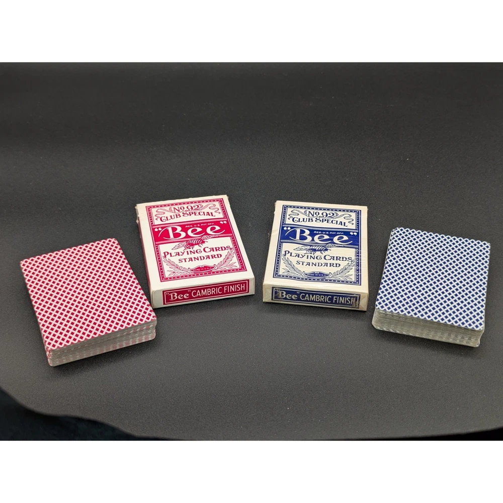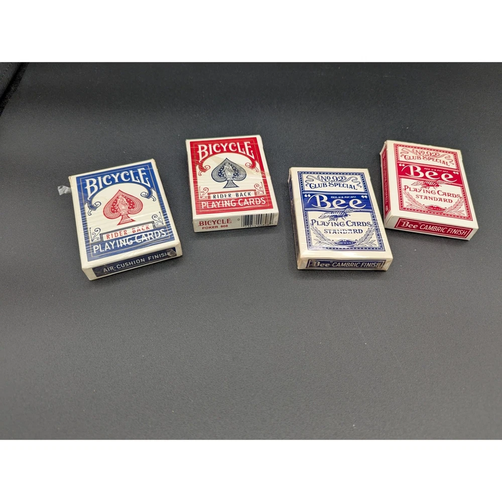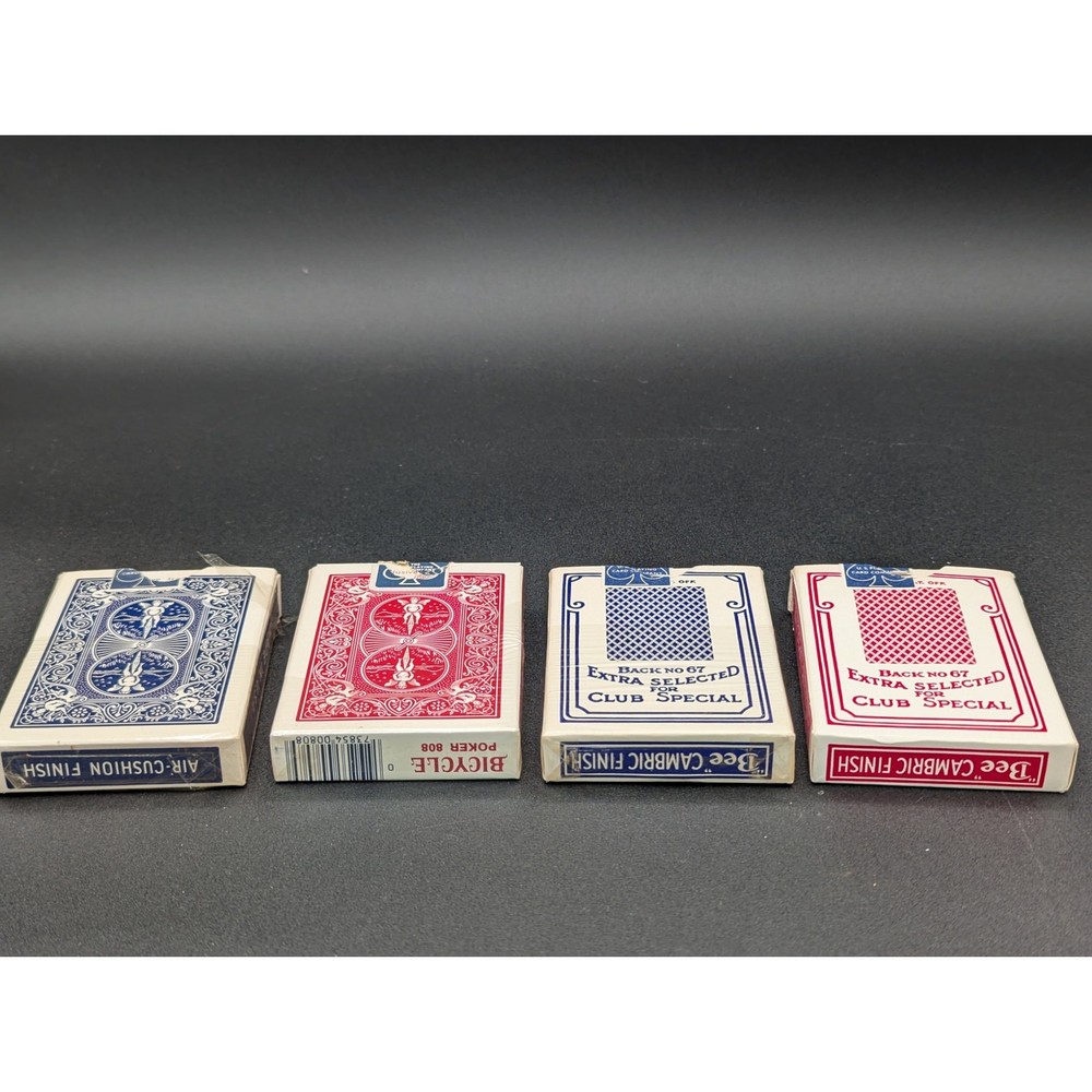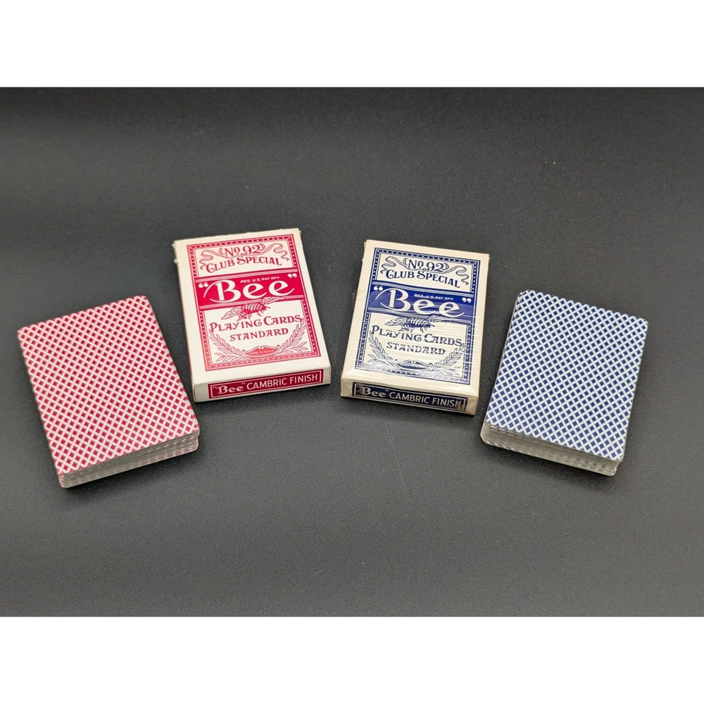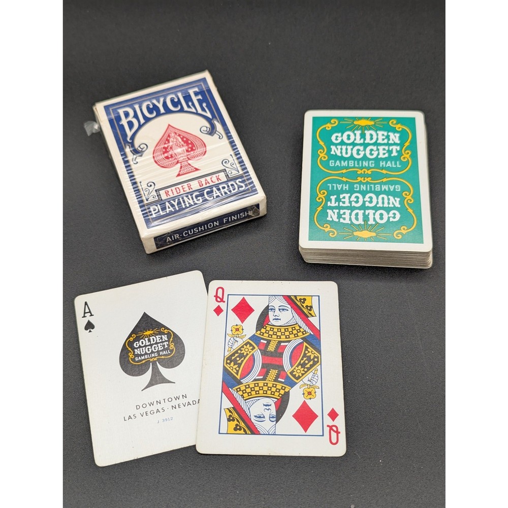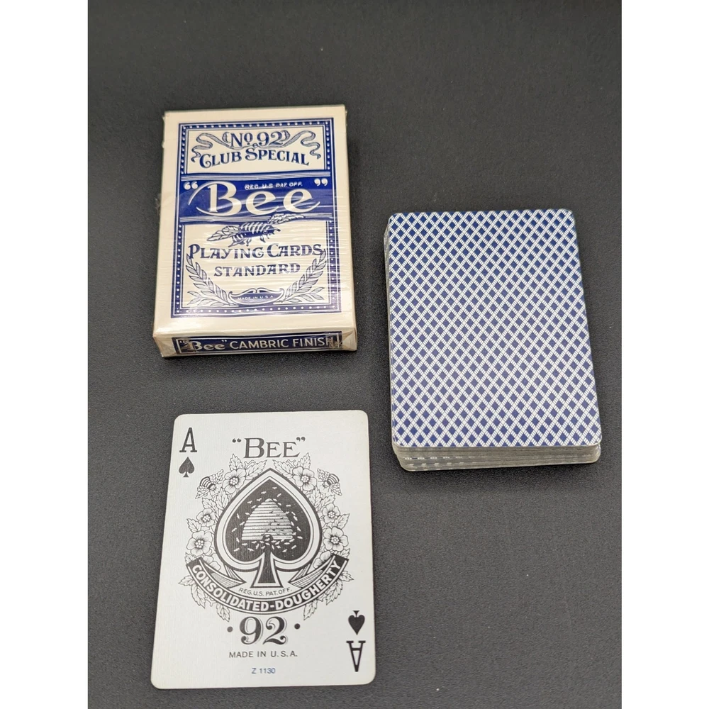 This item includes 4 boxes of Vintage playing cards. Cards are in good used condition. Check out my other listing for more vintage playing cards and games. 1. Bicycle Playing Cards - red box; air-cushion finish; made in U.S.A., made in Cincinnati OH 45212; rider back playing cards; Poker; complete set of 52 cards plus jokers; cards in like new condition; box still has part of plastic outer wrapping 2. Bicycle Playing Cards - blue box; THESE ARE NOT BICYCLE PLAYING CARDS; set of Golden Nugget Gambling Hall playing cards in green and gold; complete set of 52 cards; no jokers; Ace of spades says Downtown Las Vegas Nevada J 3912; good, used condition; box still has part of original plastic wrapping and again, no Bicycle cards in blue box - contains Golden Nugget playing cards 3. Bee - Blue Diamond Pattern; No. 92 Club Special; "Bee" cambric finish, Reg US Pat Off "Bee"; Back of box reads - Back No 67 Extra Selected for Club Special; Side of Box reads - Consolidated-Dougherty Division of United States Playing Card Company; complete set of 52 cards; no Jokers; Ace of spades Z1130; packaging box still has some of original plastic wrapping 4. Bee - Red Diamond Pattern; No. 92 Club Special; "Bee" cambric finish, Reg US Pat Off "Bee"; Back of box reads - Back No 67 Extra Selected for Club Special; Side of Box reads - Consolidated-Dougherty Division of United States Playing Card Company; complete set of 52 cards; no Jokers; Ace of spades J3345