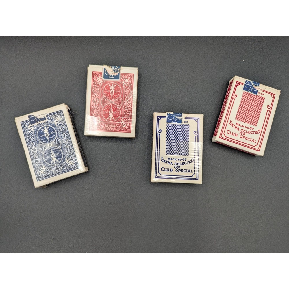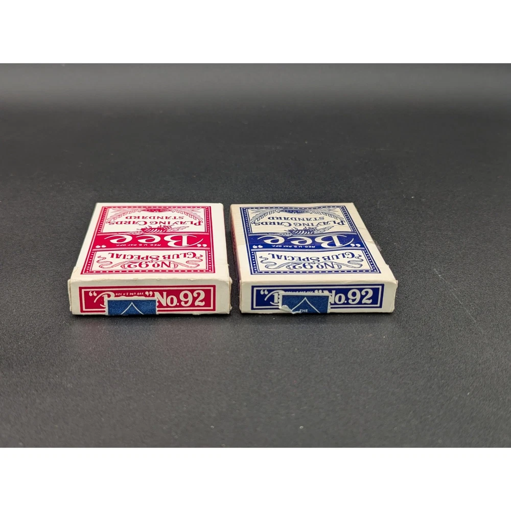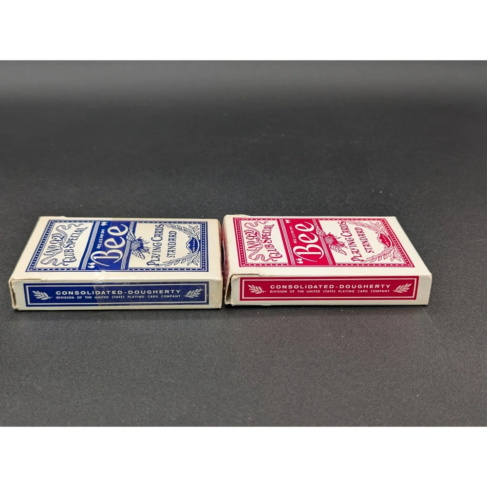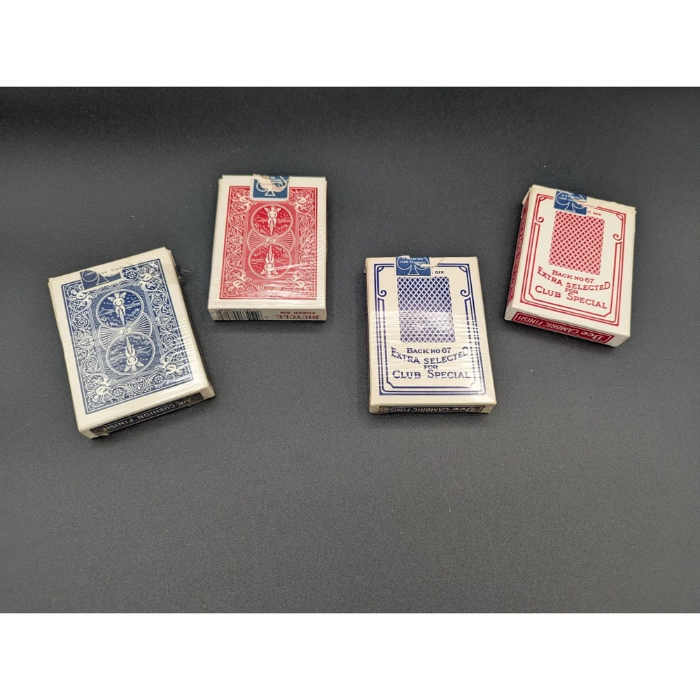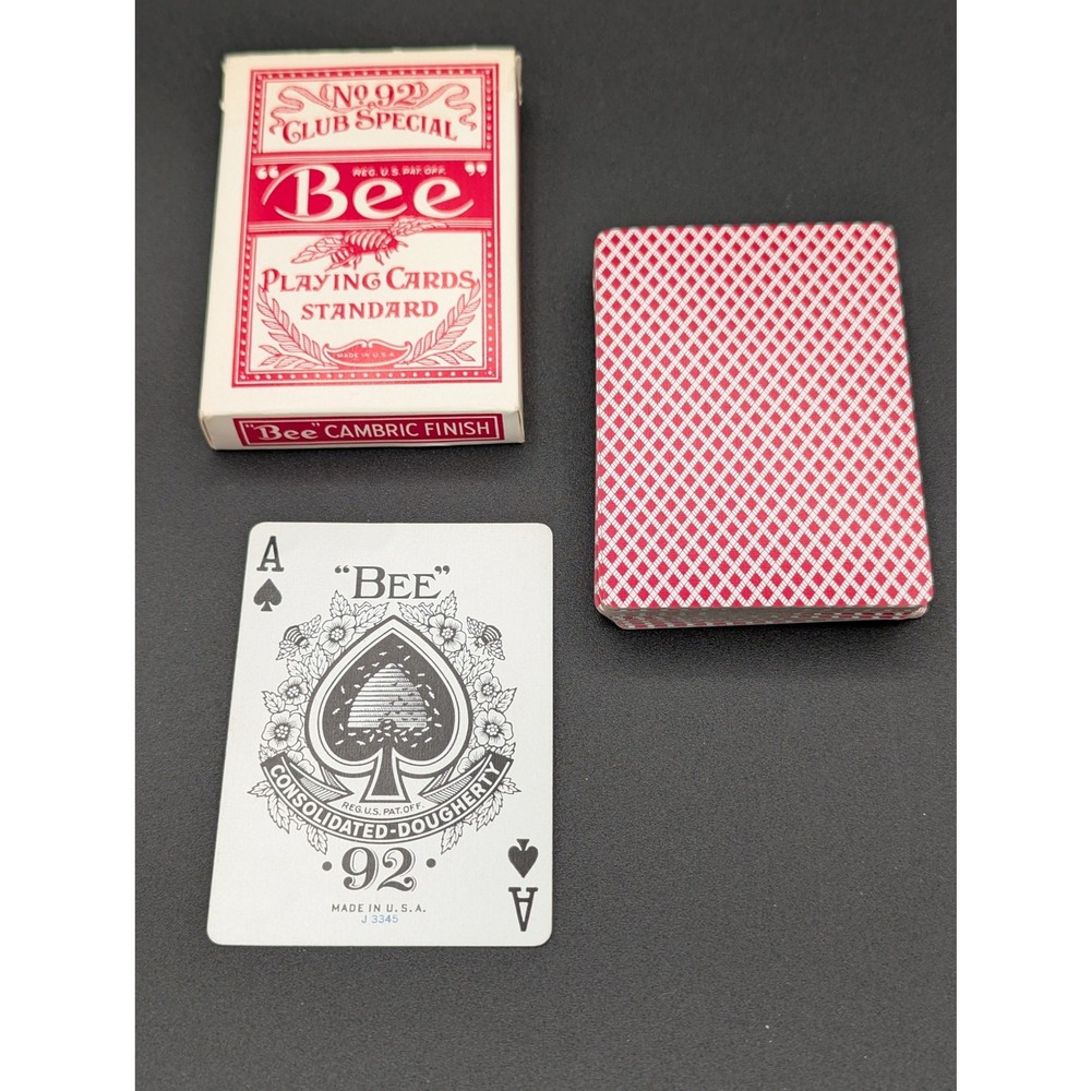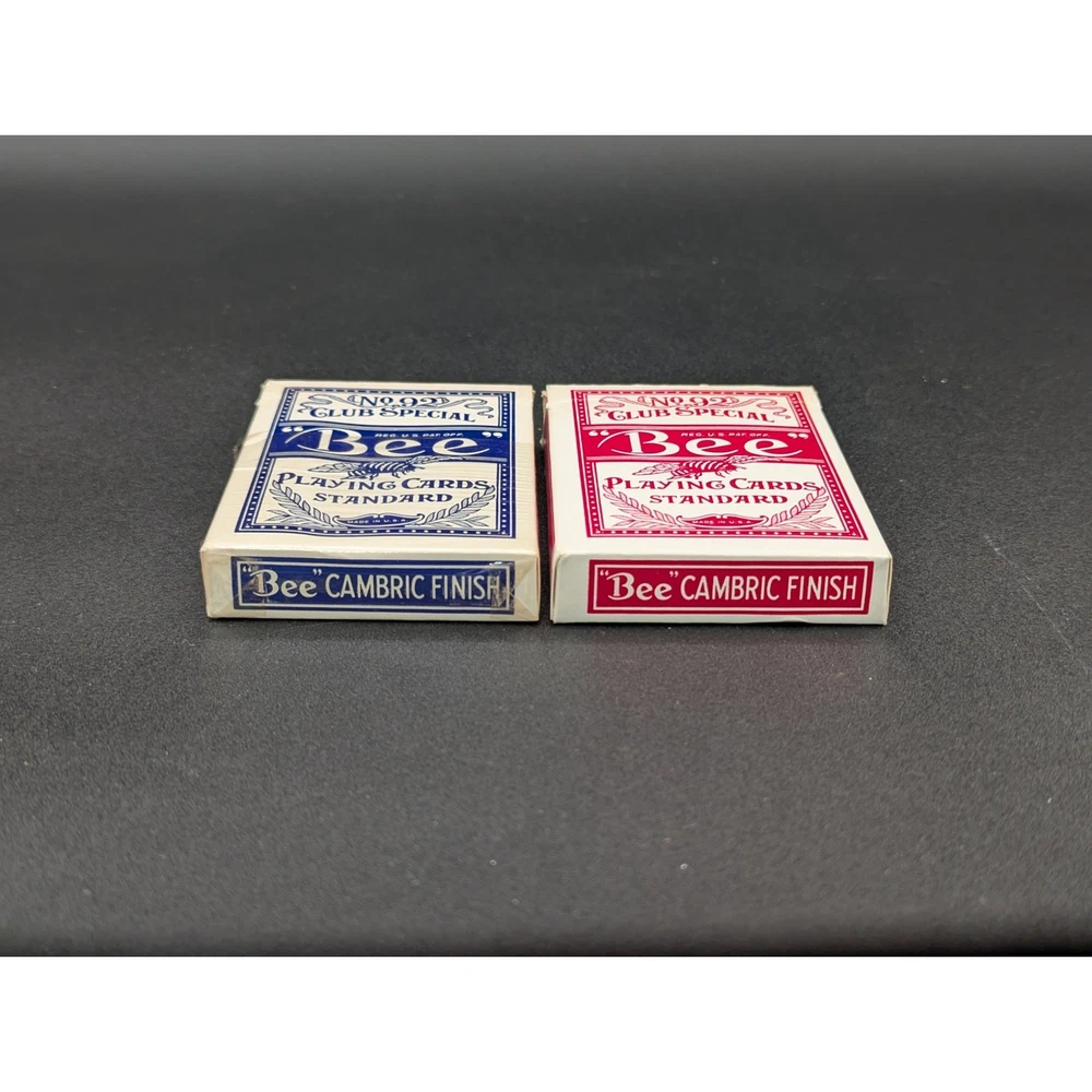 This item includes 4 boxes of Vintage playing cards. Cards are in good used condition. Check out my other listing for more vintage playing cards and games. 1. Bicycle Playing Cards - red box; air-cushion finish; made in U.S.A., made in Cincinnati OH 45212; rider back playing cards; Poker; complete set of 52 cards plus jokers; cards in like new condition; box still has part of plastic outer wrapping 2. Bicycle Playing Cards - blue box; THESE ARE NOT BICYCLE PLAYING CARDS; set of Golden Nugget Gambling Hall playing cards in green and gold; complete set of 52 cards; no jokers; Ace of spades says Downtown Las Vegas Nevada J 3912; good, used condition; box still has part of original plastic wrapping and again, no Bicycle cards in blue box - contains Golden Nugget playing cards 3. Bee - Blue Diamond Pattern; No. 92 Club Special; "Bee" cambric finish, Reg US Pat Off "Bee"; Back of box reads - Back No 67 Extra Selected for Club Special; Side of Box reads - Consolidated-Dougherty Division of United States Playing Card Company; complete set of 52 cards; no Jokers; Ace of spades Z1130; packaging box still has some of original plastic wrapping 4. Bee - Red Diamond Pattern; No. 92 Club Special; "Bee" cambric finish, Reg US Pat Off "Bee"; Back of box reads - Back No 67 Extra Selected for Club Special; Side of Box reads - Consolidated-Dougherty Division of United States Playing Card Company; complete set of 52 cards; no Jokers; Ace of spades J3345
