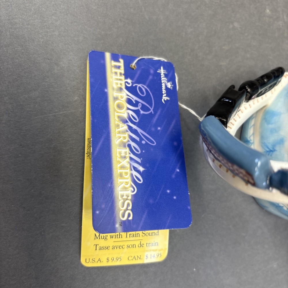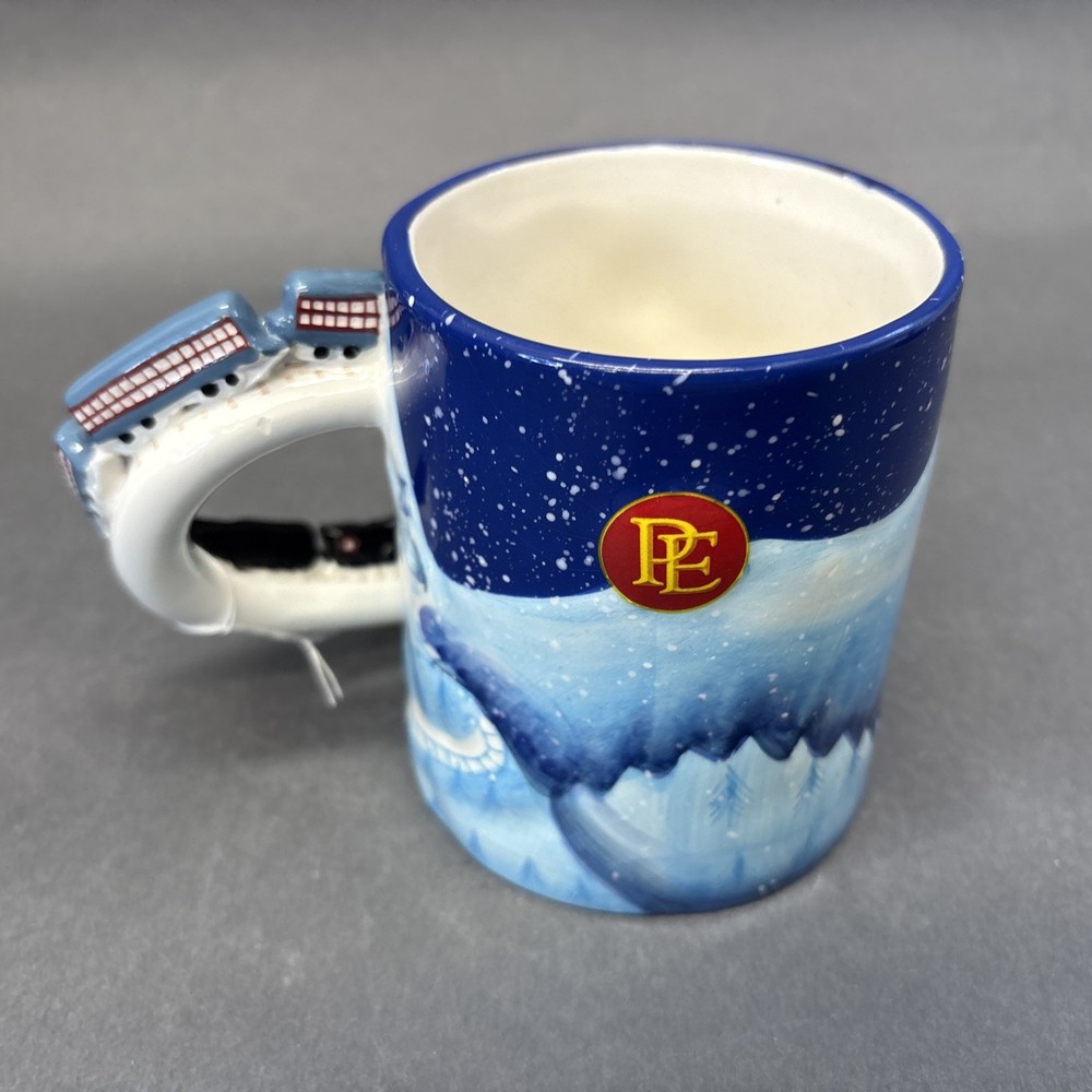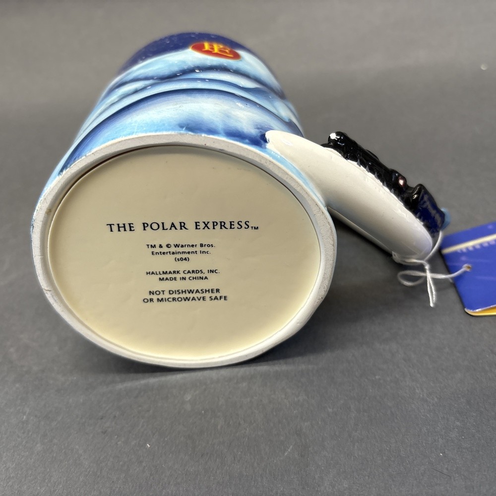 The Vintage Polar Express Mug with a Figural Train Handle from Christmas 2004 is a charming collectible item that would make a unique addition to any kitchen or collector's display. This large ceramic mug, featuring a blue color and embossed design, is not only a functional coffee mug but also a nostalgic piece celebrating the beloved film franchise. With its 12 oz capacity and festive theme, this Hallmark brand mug is perfect for enjoying hot beverages during the Christmas season or any time of year. With working sound