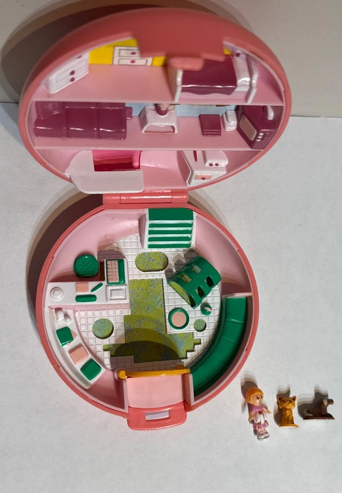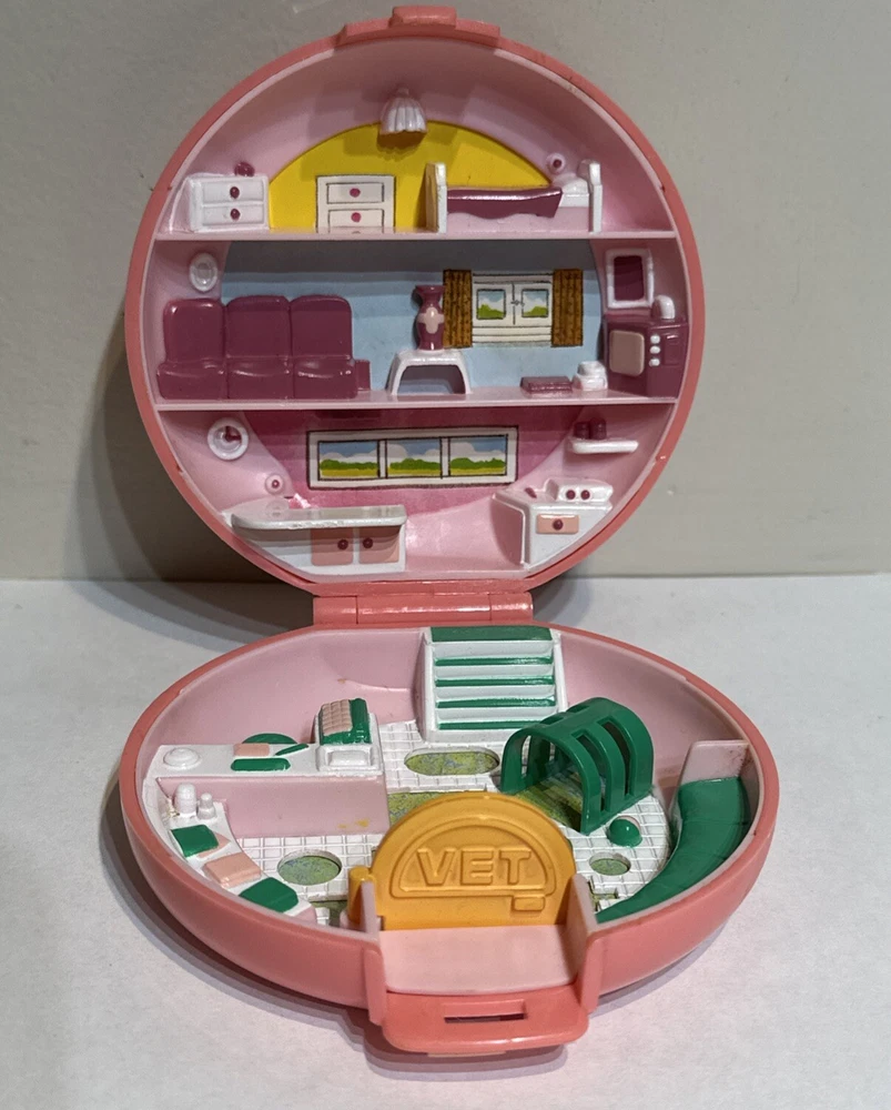 COMPLETE In very good condition see photos Relive cherished memories with the Vintage Polly Pocket Buttons Animal Hospital Vet Playset, a treasured find for collectors and fans of the iconic Bluebird brand. This complete set from 1989 comes in a compact size, featuring the beloved character Polly Pocket and her animal friends. The playset showcases the classic light complexion and straight orange hair of the 1-inch doll, with brown eyes that reflect her vibrant personality. Crafted from durable plastic, this doll playset is a snapshot of the 1980s nostalgia and represents a piece of Polly Pocket history. It includes all the original accessories attached in a circular compact, allowing you to recreate your favorite scenes or imagine new adventures. This original, non-antique yet vintage piece, without its original packaging, brings the magic of Polly Pocket's world right into your home.