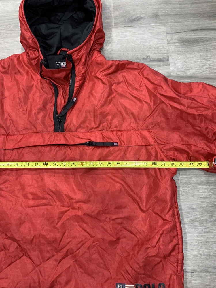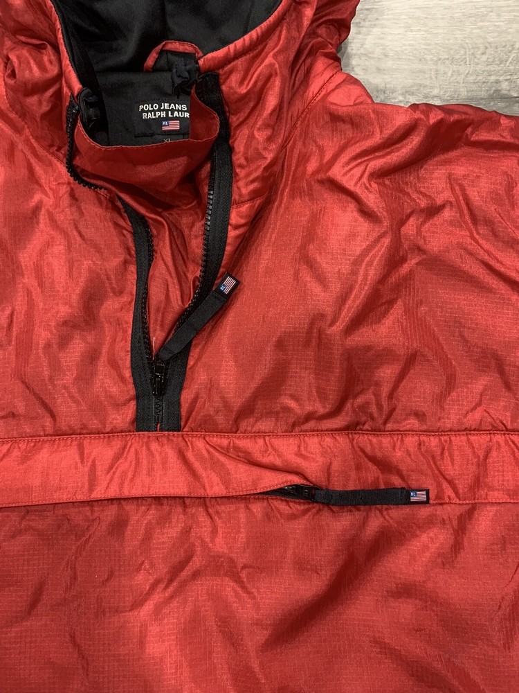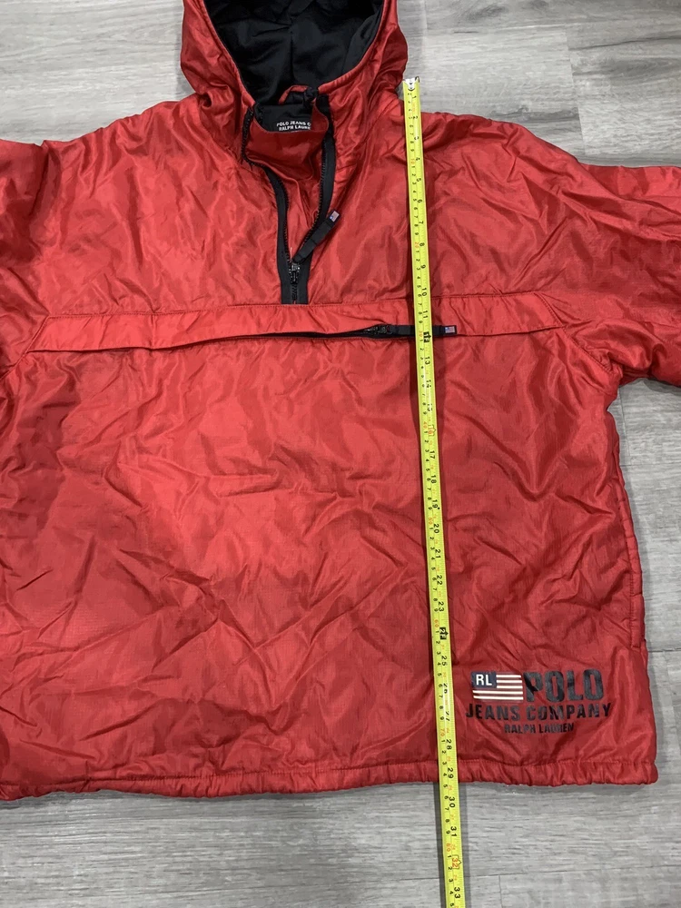 Step out in style with this vintage Polo Jeans Co Ralph Lauren windbreaker jacket. The jacket is made of high-quality cotton material and features a solid pattern with a mid-length coat design. It comes with a 1/4 zip and a hooded feature, making it perfect for travel and casual occasions. The jacket is a size XL and comes in a vibrant red color with a striking logo accent. It is a regular fit and is suitable for regular size types. The jacket is a perfect addition to your wardrobe, with features that make it stand out.