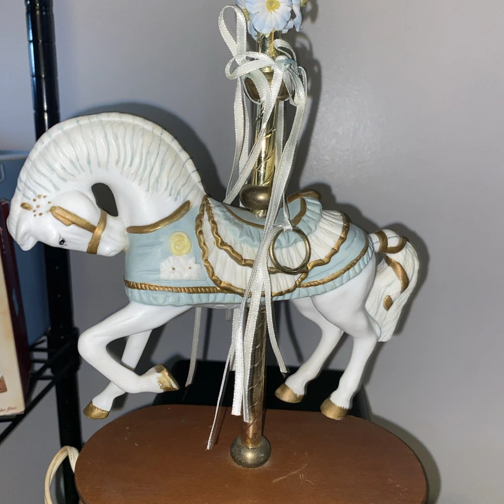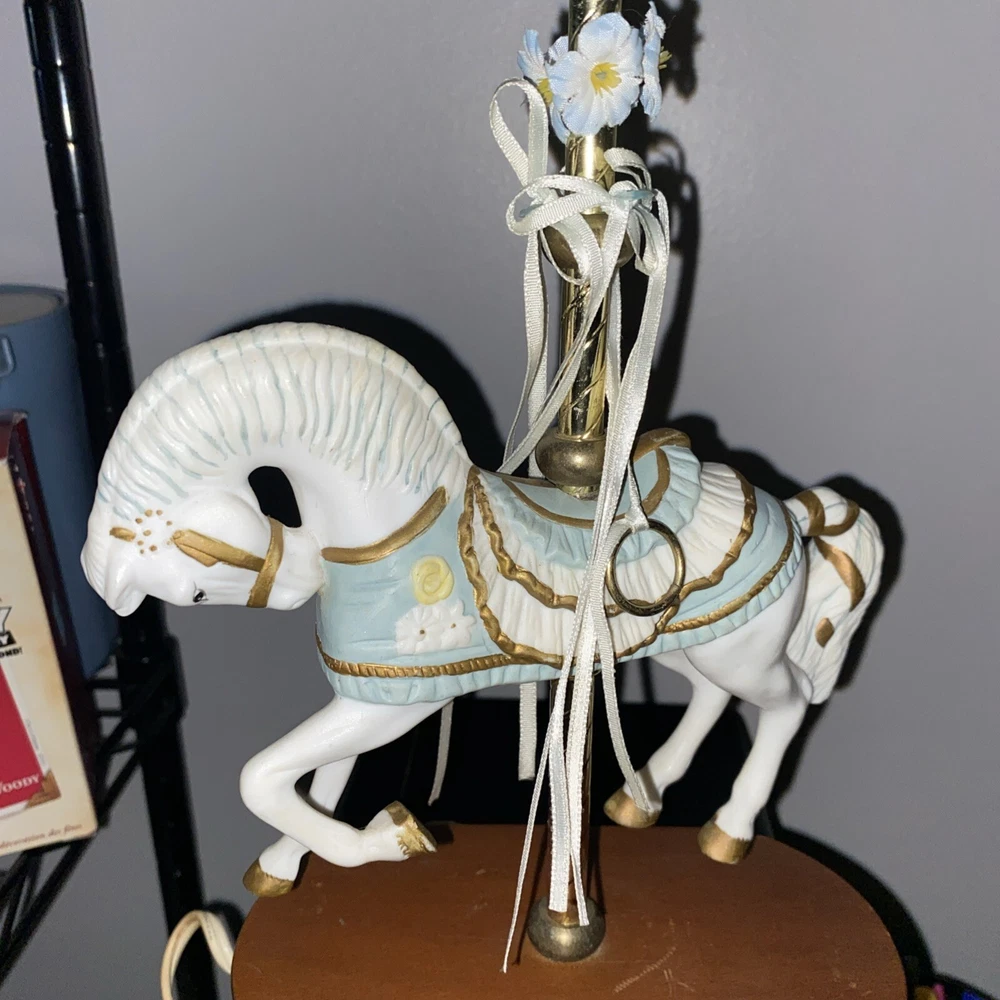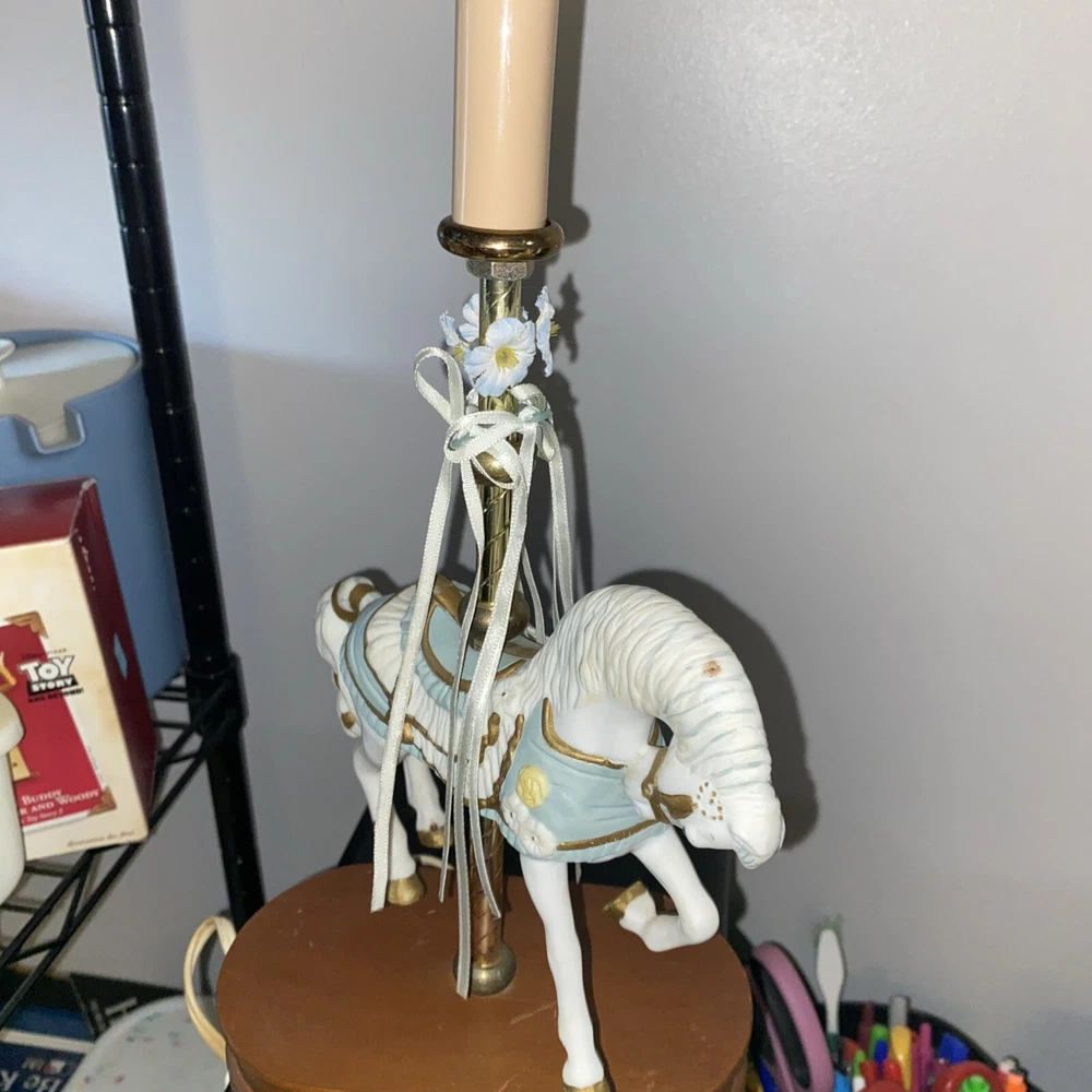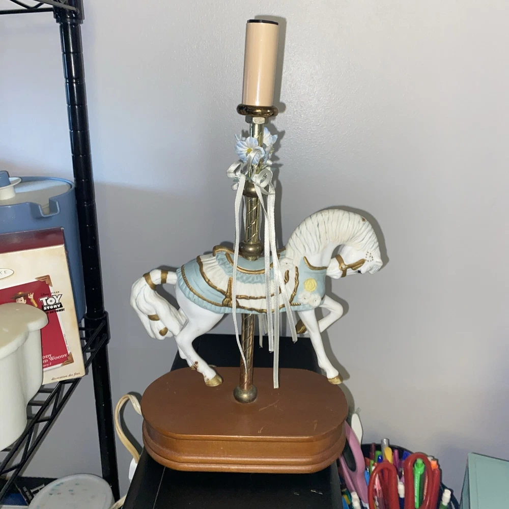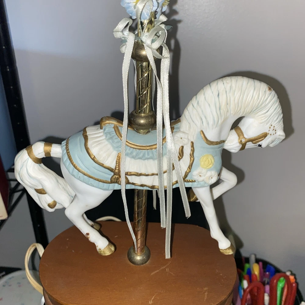 This vintage porcelain carousel horse lamp by House of Lloyd is a beautiful addition to any collection. The lamp features a colorful design with a horse subject, making it perfect for girls' rooms or nurseries. The lamp is made of high-quality porcelain material and comes with one lamp in the pack. The House of Lloyd collection is known for its unique and elegant designs, and this lamp is no exception. It's perfect for collectors or anyone looking to add a touch of vintage charm to their home decor. The lamp's multicolor design and intricate details make it a standout piece that will catch the eye of anyone who sees it.