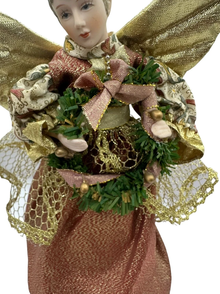 Vintage Porcelain Christmas Tree Top Angel Victorian Print Dress Gold Wings 10”