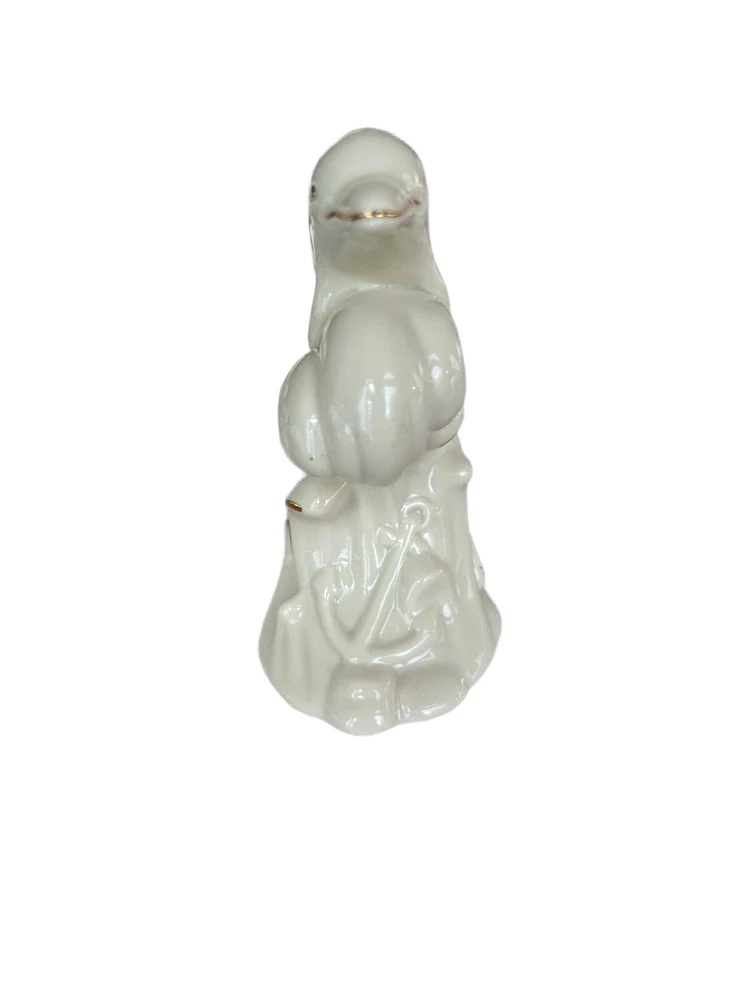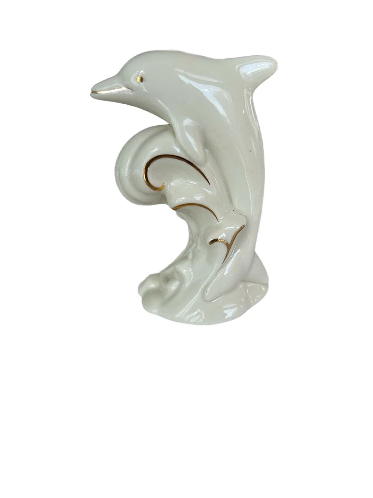 This vintage Lenox porcelain figurine features a beautiful ivory gold color with a high gloss finish. The figurine depicts a dolphin with a gold trim and is perfect for any room or occasion. It was manufactured in China in the 1980s and is an original piece from the brand's animal collection. The figurine is small in size and features an all-over pattern with a nautical and animation theme. It is suitable for adults and does not come with any signs or character family. This piece is a great addition to any decorative collection and is sure to enhance any space. Good condition