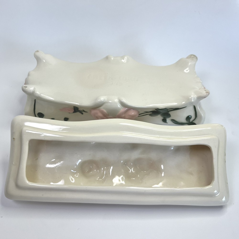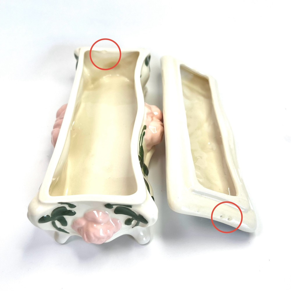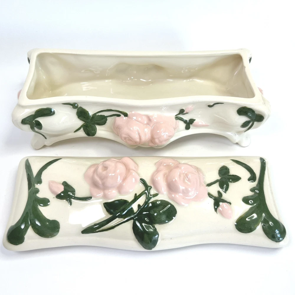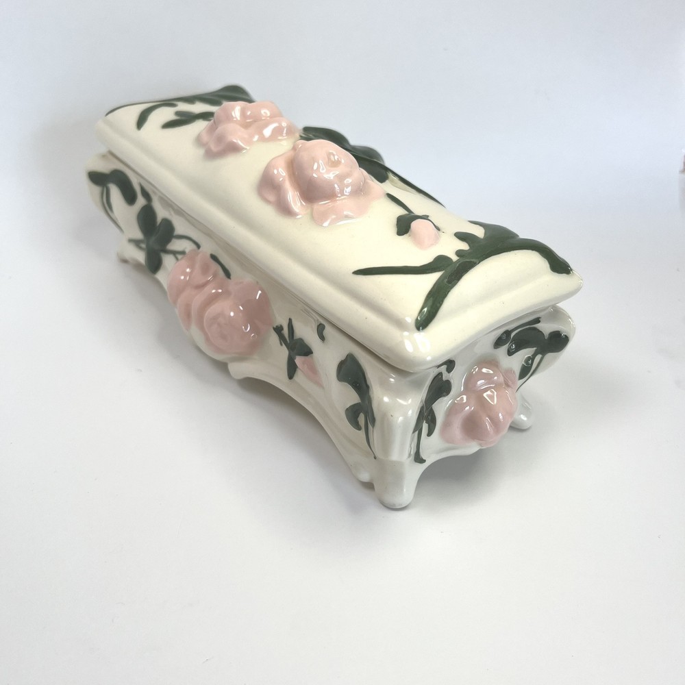 Add a touch of vintage elegance to your décor with this charming Victorian-style ceramic trinket box. This delightful piece features a classic design with delicate pink roses and green leaves, perfect for storing jewelry, small treasures, or simply displaying as a decorative accent. This trinket box boasts a footed design with four ornate legs, adding a touch of sophistication. The removable lid is adorned with sculpted pink roses and green leaves, creating a beautiful focal point. The interior provides ample space for storing your precious items. Crafted from ceramic, this box has a smooth, glossy finish that complements its Victorian-inspired aesthetic. The soft pink and green hues create a romantic and timeless appeal. Please note that this trinket box exhibits minor signs of wear, consistent with its vintage style. These signs of wear are visible in the provided photographs. Please examine the photos carefully as they are an integral part of the description and accurately represent the item's condition. This trinket box is perfect for a variety of uses, from storing jewelry and keepsakes to adding a decorative touch to your vanity, dresser, or shelf. It would also make a lovely gift for someone who appreciates vintage-inspired décor.