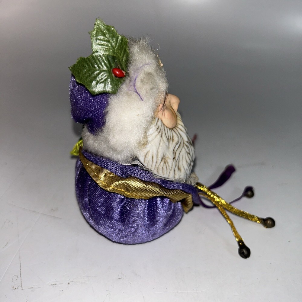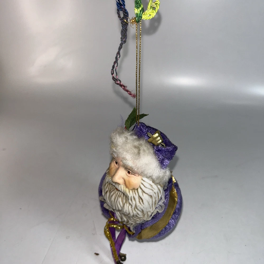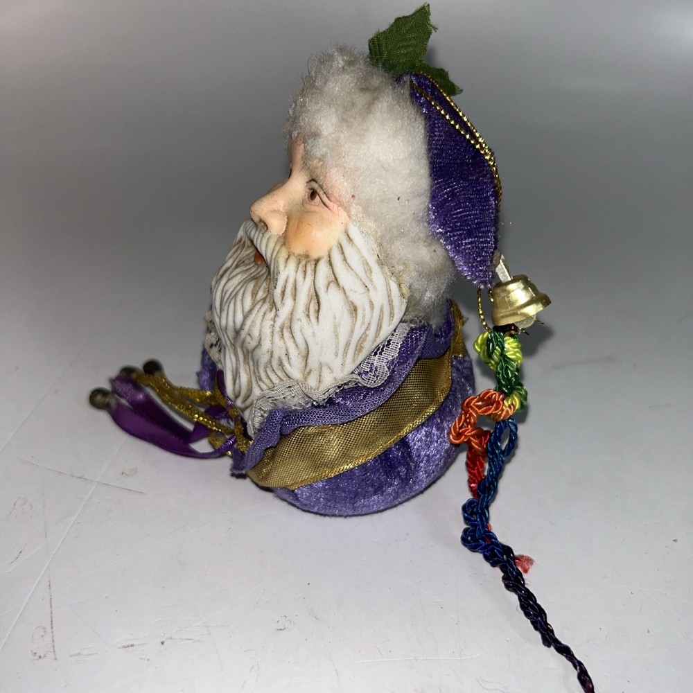 HomeVintage Porcelain Santa Face Ornament with Velvet Ball Purple Lace Ribbon Bells