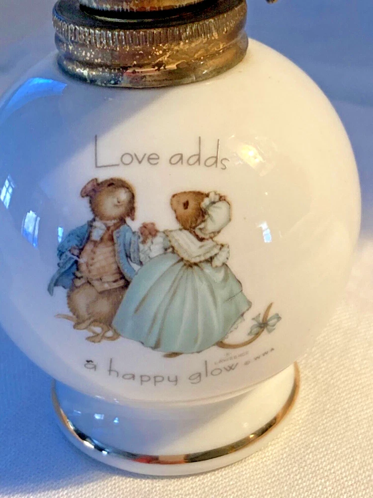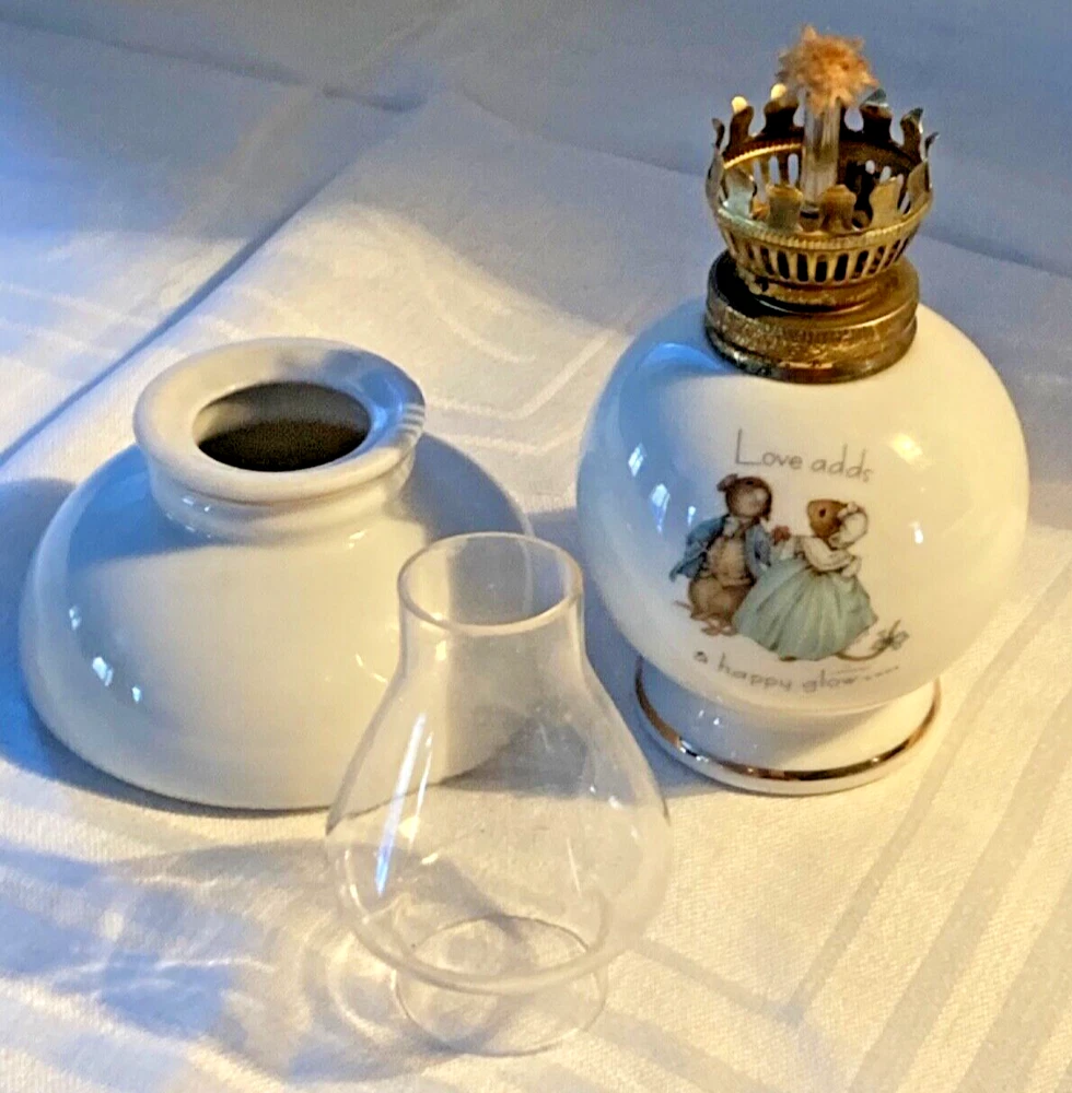 Cute small oil porcelain lamp decorated with mouse couple, Is in working order, has funnel and shade, gold trimmed, 7 inch high by 3 inches wide. Has little ink spot over the a, which must have happened at time of production. Made in Japan, 1975, states Love adds happy glow. Cleveland, Ohio, 44144, printed on the bottom.