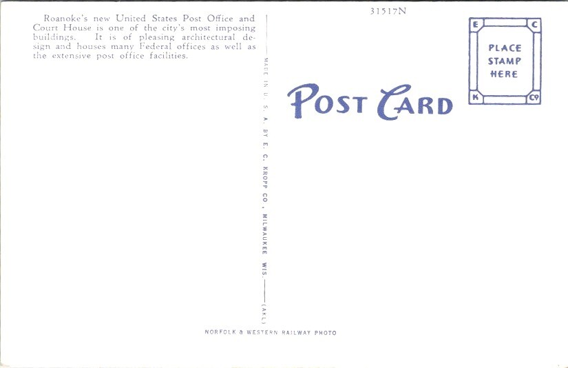 Vintage Postcard Post Office Architecture Roanoke Virginia 1930-1945 18065