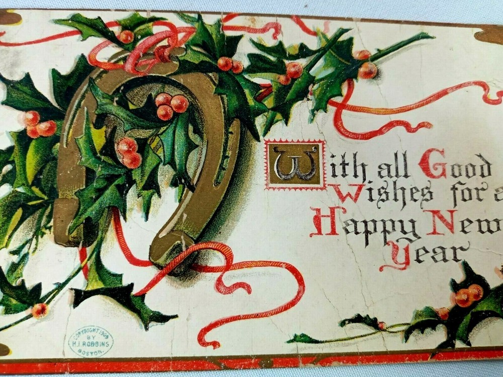 Vintage Postcard With all Good Wishes for a Happy New Year Horseshoe & Holly