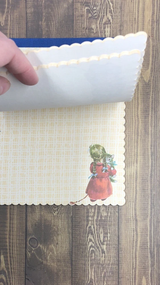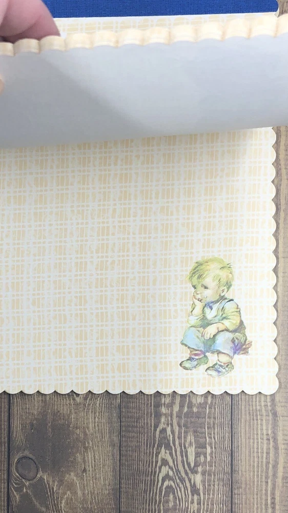 Vintage Pratt & Austin “Rusties” Scalloped Notepad Paper. Incomplete 24 Sheets. 6 girl holding flowers 0 boy holding flowers 9 red dress 9 boy sitting down Very good condition, *****except pages have come away from the binding.
