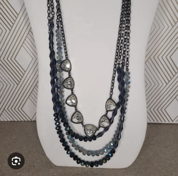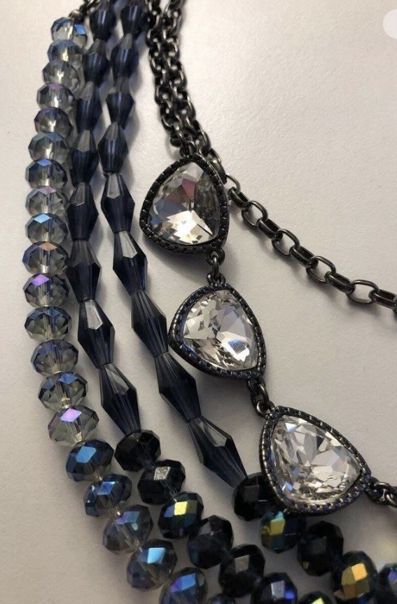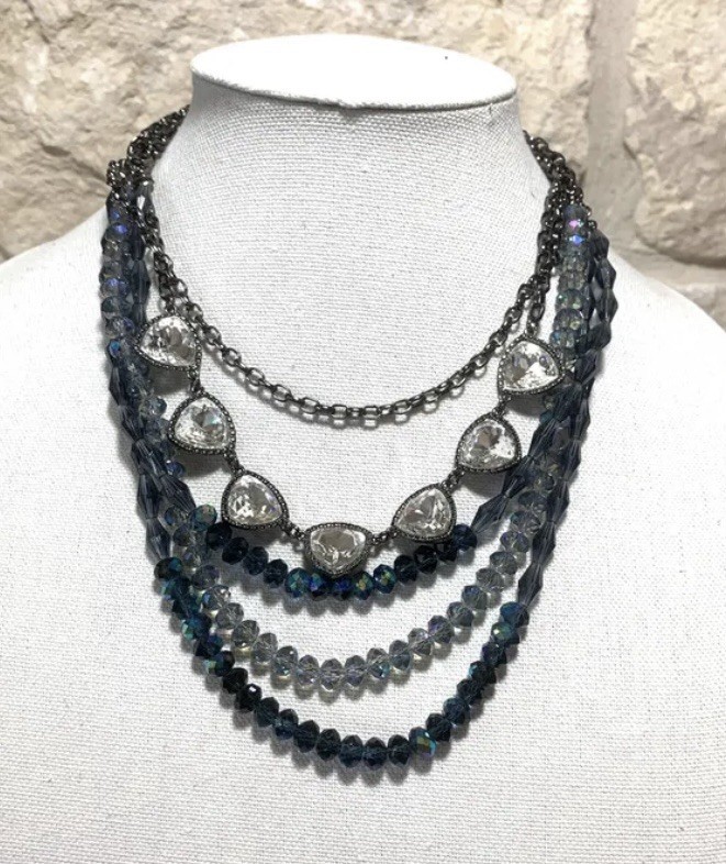 Item description from the seller This is a beautiful Premier Designs MONTANA necklace with a triangle pendant and hematite, crystal, and glass beaded layers. The necklace features a lovely multicolor blue and black theme, which is perfect for any fashionable woman. It is adjustable, stackable, and reversible, making it versatile enough for a variety of looks. As pictured, it can be worn as a single layer or multiple layers and I have included a crystal edged clip to help with all the different ways. Measuring 18"-38" in length, it is a great addition to any jewelry collection.