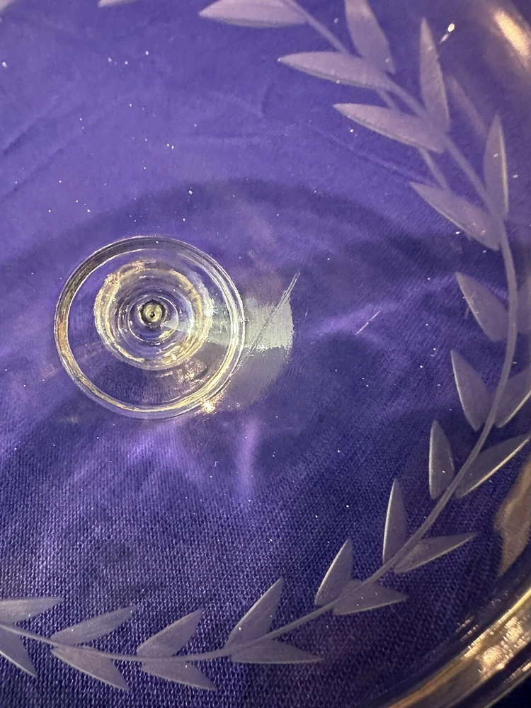 Pretty floral etched candy dish and lid. Dimensions Height - Bowl: 2 1/2 inches Bowl with lid: 6 inches Weight- 1 lb, 3 oz Diameter - 5 inches Very good condition with no discernible cracks or chips on bowl. Lid has a scratch. Etching is in excellent condition. Please refer to pictures. Sold as is.