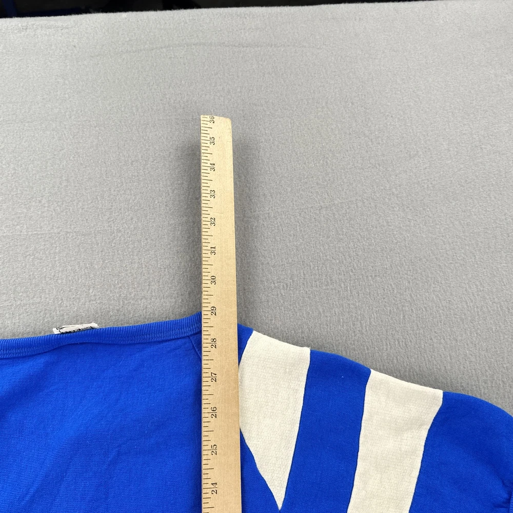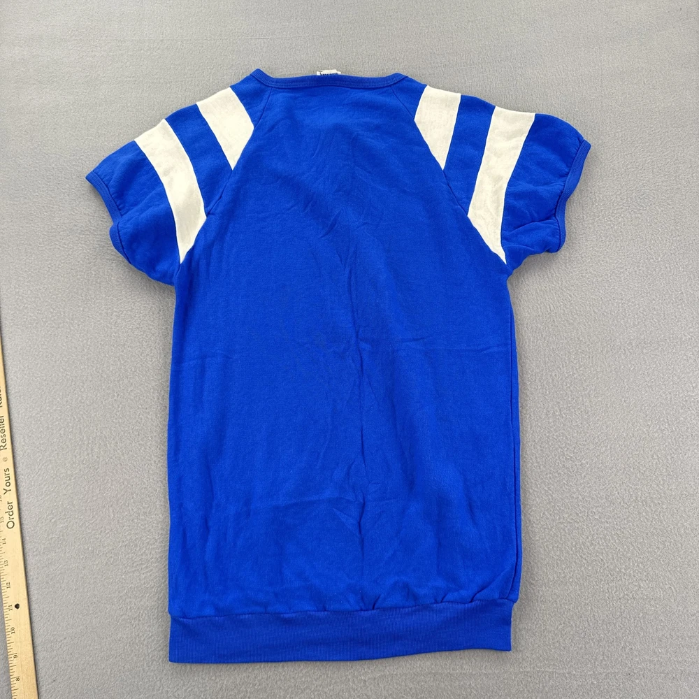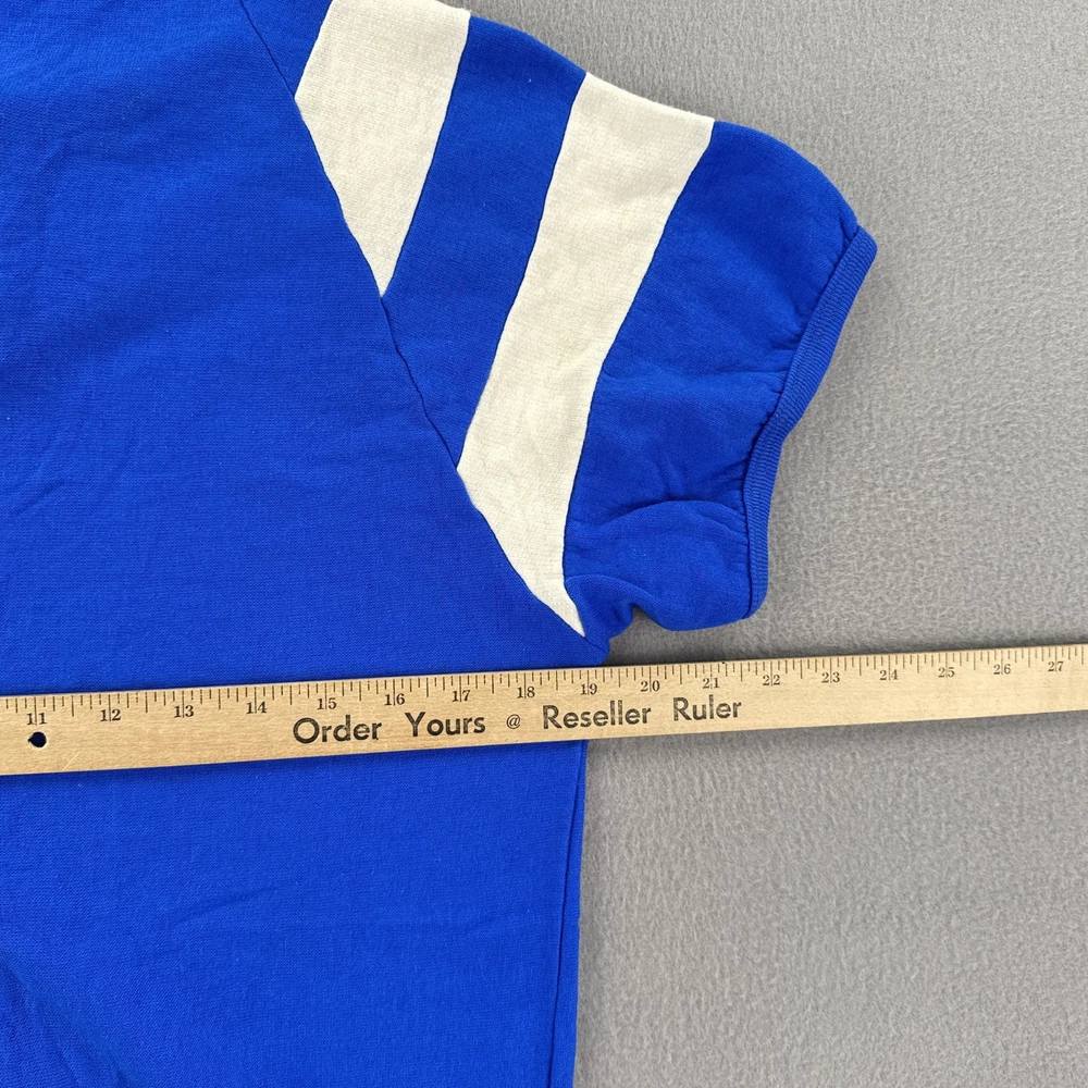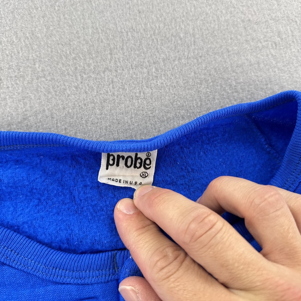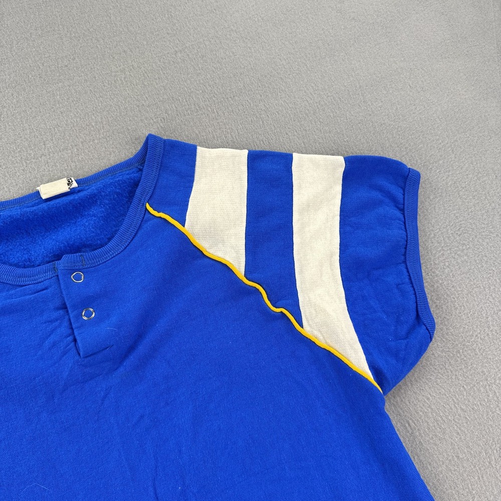 Vintage Probe Shirt Mens Extra Large Blue White Striped Raglan Made in USA Condition: Good vintage condition with light wear, no holes or major flaws, minor natural fading from age Tag: Probe XL, Made in U.S.A. Features classic athletic 70s/80s styling with white stripes on both sleeves and yellow piped seams Henley snap front with two silver snap buttons at collar Soft fleece interior lining, single piece front and back construction, ribbed hem Vivid cobalt blue color with contrasting white sleeve stripes and yellow detail Material tag not visible, feels like vintage cotton/poly blend common in era Approximate fit: Mens Extra Large (see photos for flat measurements) Great for collectors, vintage sports enthusiasts, or 70s/80s retro style fans