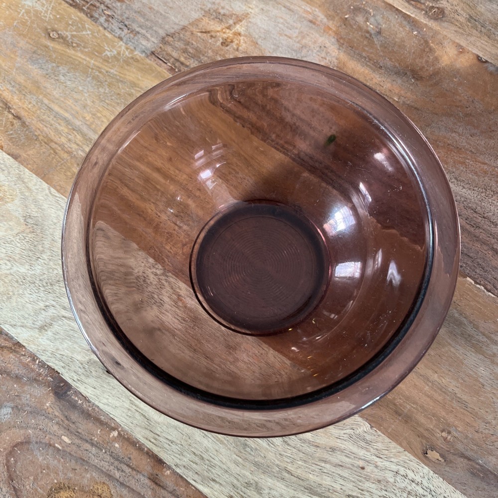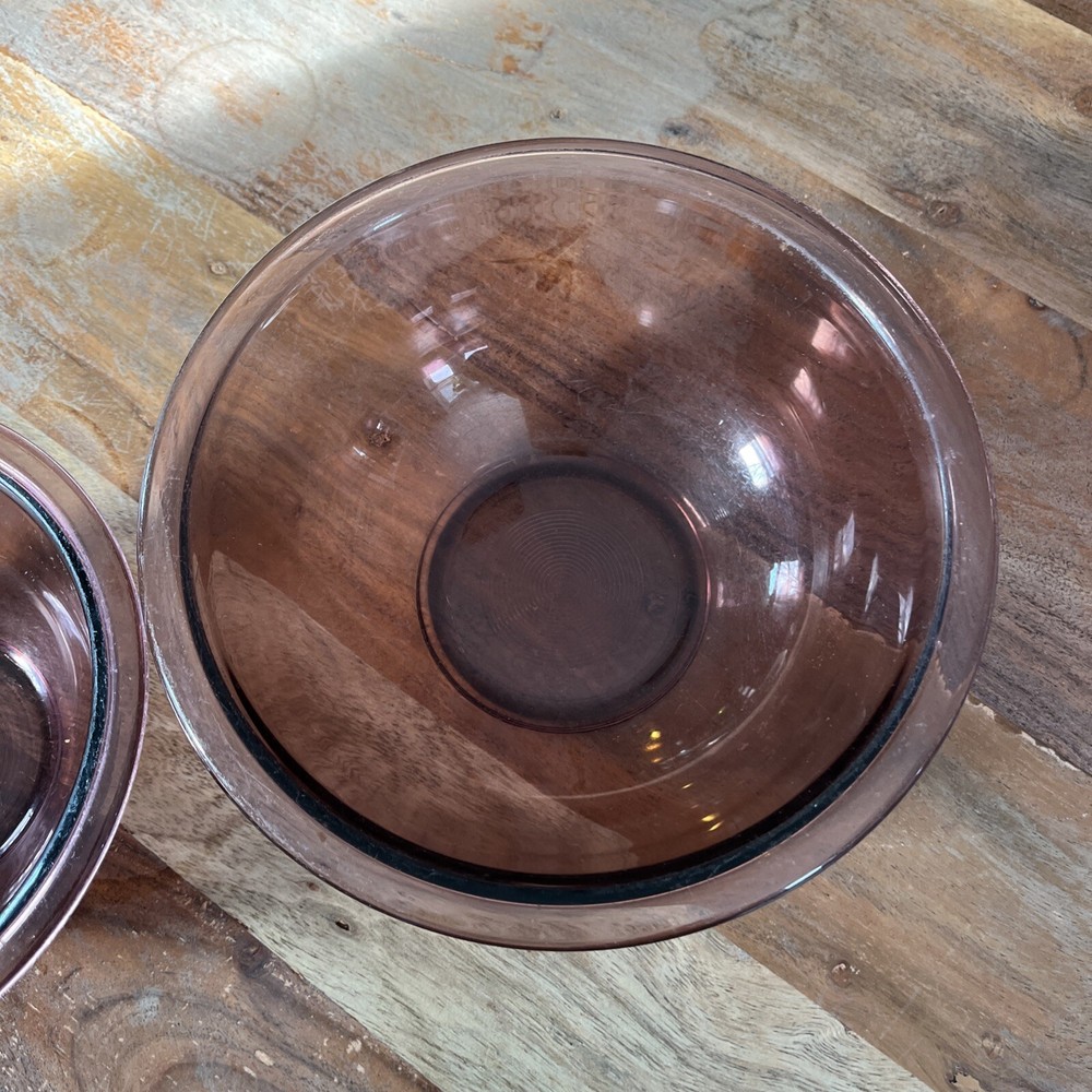 Add a pop of vintage charm to your kitchen with this set of two Pyrex Vision mixing bowls. The bowls are made of durable glass and have a glossy finish. The cranberry purple color gives these bowls a retro vibe, and they are perfect for all occasions. The set includes bowl model numbers 322 and 323, and they are original Pyrex products from the late 20th century. These bowls are a great addition to any kitchen and will make mixing and serving a breeze.