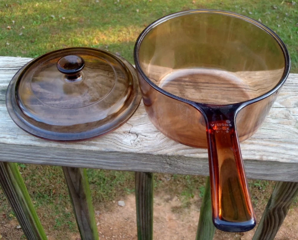 Up for auction here is a vintage Corning Pyrex Vision amber glass 1 liter sauce pan with its original lid ca. 1970's. It is in very good pre owned used condition with only some light use wear but No chips, cracks, or repair. Please see pics as they are part of the description. This sauce pan measures approx. 4 3/4" with the lid, 3" without by 6" wide across the top and 10 5/8" long from handle to outer edge. It is marked on the handle *VISIONS FRANCE V-1-B*, and "PYREX P 8 1 C" on the outer edge of the lid. Folks, this is a great vintage Visions amber glass 1 Liter sauce pan with lid and it would go great in a collection or home. USPS Priority/Parcel and FedEx Ground/Home Delivery mail true calculated shipping costs is based on a insured well wrapped and packed 4 pound shipment, box size 12x8x6. Please see the available shipping services with calculated shipping costs under the Shipping & Payments tab above the Item Specifics on our auction page or scroll down to the Shipping, returns & payments section and hit the small arrow on the right of Returns, thanks. NO WORRIES ... YOU CAN BID HERE WITH CONFIDENCE! We are a true U.S. seller, NOT a drop shipper and item ships from our U.S. location! As always ... Low Opening Bid and Never a Reserve! Plus, we NEVER end an auction early or CANCEL a bid after the auction has ended! PLEASE BID ONLY IF YOU ARE SERIOUS and INTEND TO PAY IF YOU ARE THE SUCCESSFUL WINNER! Our quality merchandise come directly from Estate Sales, private homes, thrift shops, and local auctions hand picked and purchased by my husband and me. As most of you may know, most vintage or used items will have some age and/or wear, and here we like to describe as accurate as possible and show many photos, so you know exactly what you are bidding on. So please read our detailed description and look at the pics as they are part of the description and ask any questions prior to a bid. Lord knows we are all only human and do make mistakes, but we honestly try very hard not to here so please rest assure and bid with confidence. Typically, our photos are shot outdoors under natural lighting on a not so fancy old railroad tie, rail, against our home, or somewhere outdoors, so please excuse any camera reflection glares, white spots or specks and shadows. Yes, we are old school and our descriptions also may be more lengthy than others, but we like you know exactly what you are buying/bidding on so there are no surprises. Please read the entire description, see all photos and ask any questions before placing a bid. All emails/messages are answered. We are rural and ship by USPS Priority/Parcel and FedEx Ground/Home Delivery (true calculated shipping) and (free shipping) for local pick-up. We also recycle and use over-sized boxes and new high quality packaging materials to ensure your item(s) will arrive to you safe and unharmed. We do not charge for boxes, packaging materials, gas, or handling. We do not profit any money from shipping costs. You are only charged true actual calculated postage and all items are shipped fully insured with carrier. We ship same or next day unless it is a holiday or a weekend, then shipment will be the following business work day. We ship to buyers in the United States, we do Not ship Internationally. Payment is due within 3 days of close of auction, unless you have made prior arrangements with us. A non paying bidder notice will be issued after four days and a strike goes against your account. Please bid only if you are serious and intend to pay within the allotted time frame. North Carolina buyer must pay 7% sales tax. We combine shipping to save you money and give shipping discounts on 3 or more auction wins. The eBay combined shipping calculator is not always correct, so if you win 2 or more auctions please request or wait for a combined invoice for appropriate total. Our items come from a smoke free home. We do have dogs, but all items are stored in a pet free environment until delivery day. Claims/Refunds - Please DO NOT request a return on merchandise damaged in shipping. Insurance claims can only be filed upon proof of damage (proof of damage is pictures which are most needed to file claims) and before issuing you a refund. So if your item happens to arrive to you damaged in shipping, please contact us and DO NOT THROW ANYTHING AWAY. In order to file a USPS/FedEx online claim, we must have pictures of the shipping box at every angle, shipping labels (tracking/addressee), bubble wrap, wrapping/packing materials (packing/partitions), and of course the breakage. Once we receive all the requested pictures, we can send you a full refund ASAP. We usually don't have problems, but you just never know with shipping carriers these days with all their automated robotic sorters and all. If there is a problem with your order, simply contact us. As an old-school eBay Seller, we list in the spirit in which eBay was founded; a place to find vintage, unusual, rare, hard-to-find, one-of-a-kind, and various quality items at affordable prices! SHOP, BID and BUY WITH CONFIDENCE! SATISFACTION GUARANTEED! Please, no buyer's remorse and ask any questions before placing a bid. We have been auctioning on eBay for 23+ years and truly only want the very best for you and us both. We honestly describe all our items to the best of our knowledge and ability and show many photos, but if you have a question(s) or just need further info. or pictures, please let us know. We don't just want you satisfied; we want you to be a happy returning customer for years to come! ;) THIS IS A 10 DAY AUCTION and HIGHEST BID WINS! GOOD LUCK IF YOU SHOULD BID! THANKS and GOD BLESS!