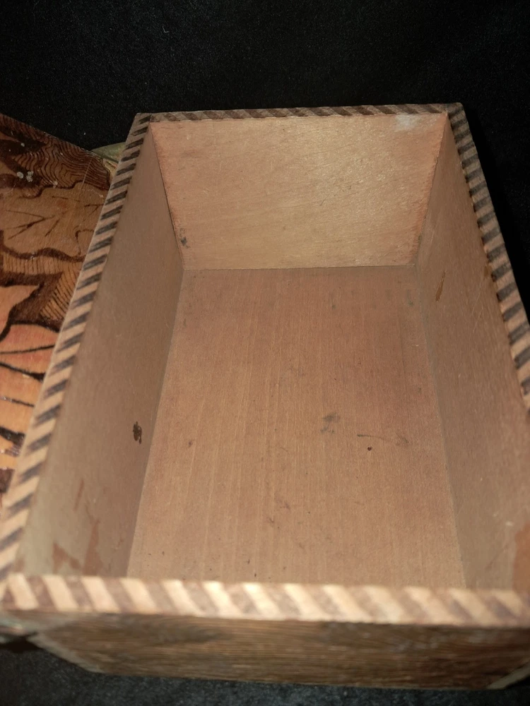 This vintage pyrography box is a beautiful addition to any collection. The rectangular shape and floral pattern make it a perfect keepsake box for any occasion. Measuring 5.75" x 4" x 3", it is medium in size and can fit in any room. The box is made of wood with a painted finish and features art nouveau style. It is perfect for teens, adults, and girls who love all occasions. The box is unboxed and has been engraved with a beautiful floral design. This original piece is a must-have for collectors and those who appreciate art.