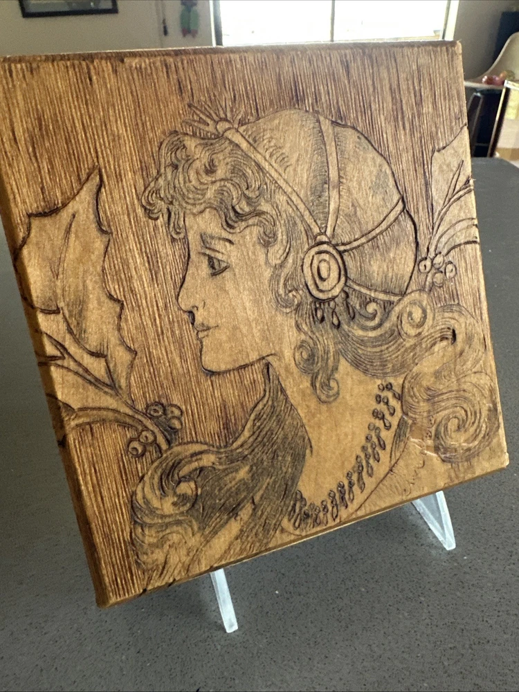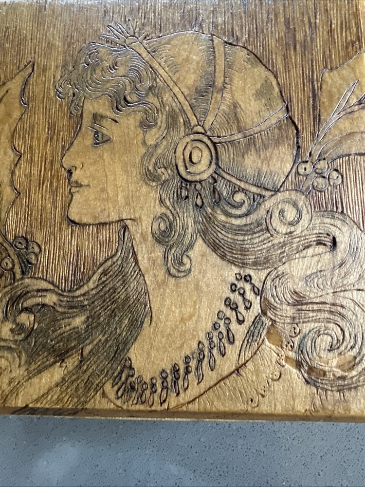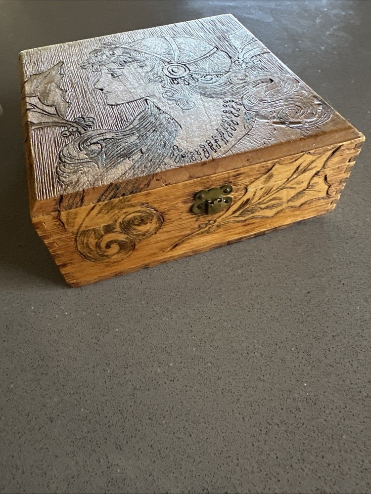 Original/Reproduction: Original Care Instructions: Clean with Damp Cloth Collection: Keepsake Boxes Handmade: Yes Number in Pack: 1 Shape: Square Theme: folk art, wood burnt wooden box, art deco lady Suitable For: Gloves, keepsakes Item Width: 6.25 Finish: Natural Color: Brown Closure Type: hinged lid Material: Wood Room: Any Room Pattern: art deco ladies face Subject: art deco ladies face Type: Pyrography Department: Adults Country of Origin: United States Occasion: All Occasions Item Length: 6.25 Time Period Manufactured: 1950-1959 Brand: “speacial H” Features: Hinged lid